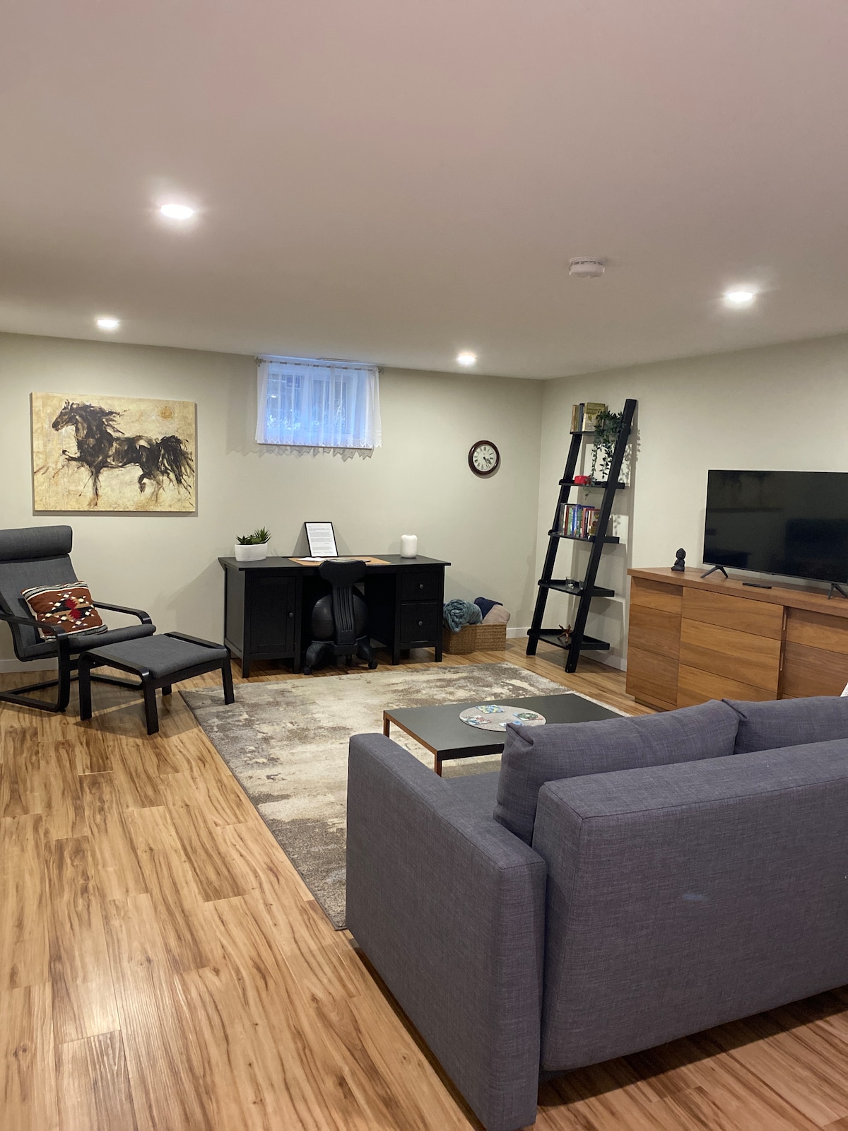 Peaceful, quiet and restful space. Basement suite has private entrance, Wifi, TV, fully equipped kitchen, large desk, laundry facilities too. One bedroom with queen size bed and new queen size sofa bed for additional sleeping space. Great neighbourhood with city park at the end of the street. Good location only 2.5 kms from hospital, 3 kms from college and 7kms from university. Excellent location for working professionals and students. Within walking distance to mall and grocery store.