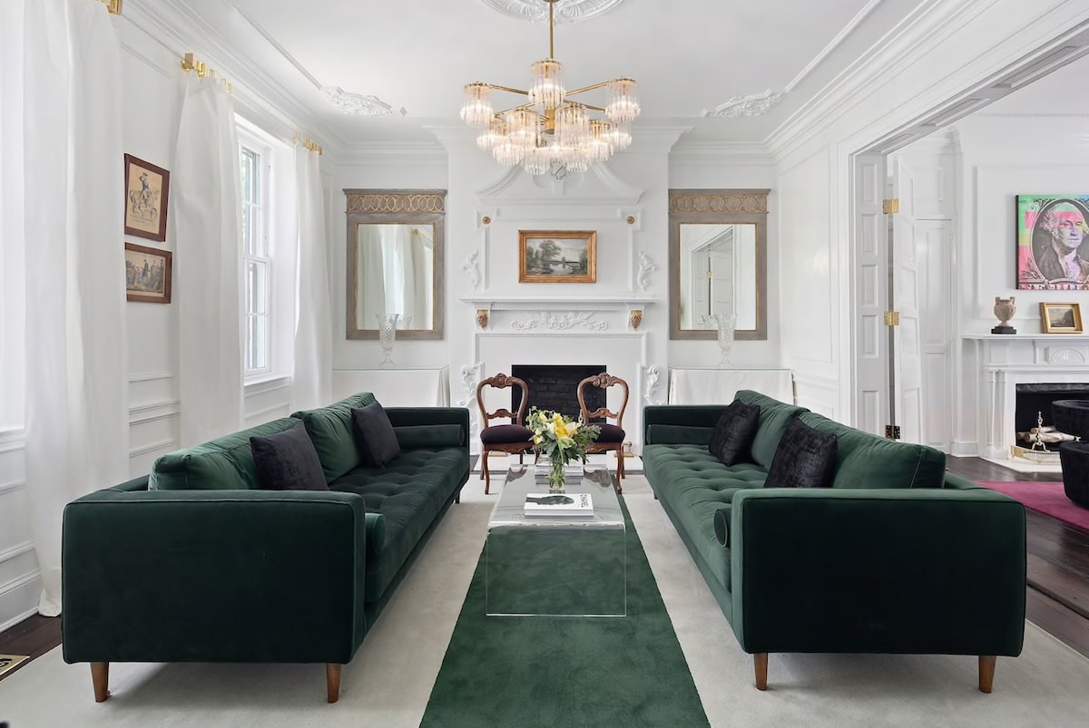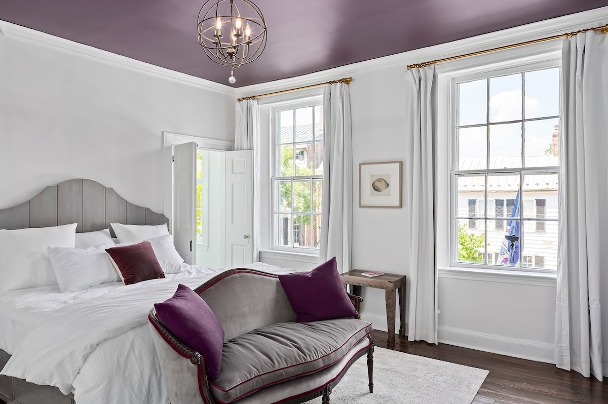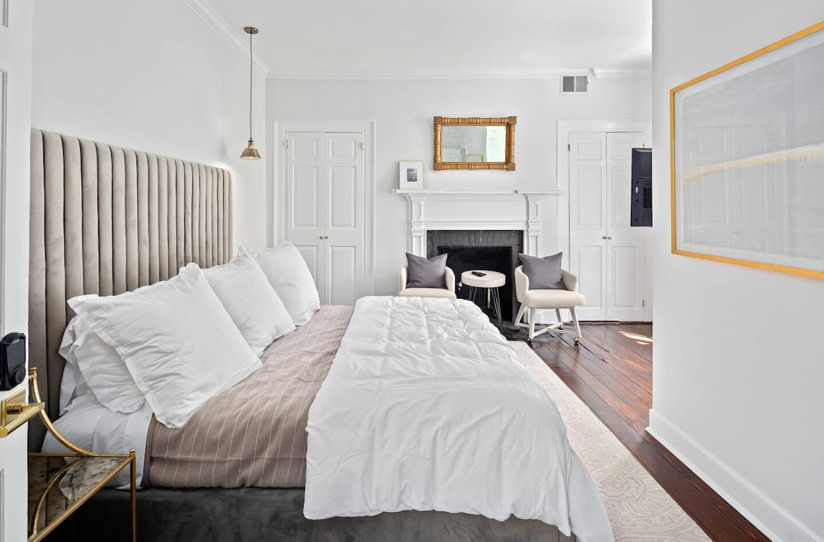 The James Madison Room is the perfect place to call home while you're visiting Old Town. On the third floor of The George, this room can accommodate up to 2 guests with its king bed. The en suite bathroom has a large walk-in shower and the room features a mini fridge. The lush velvet couch, soothing color palette and modern yet sleek design features of this room make it inviting and luxurious for you to enjoy. Views of the street and the historic homes and plenty of light