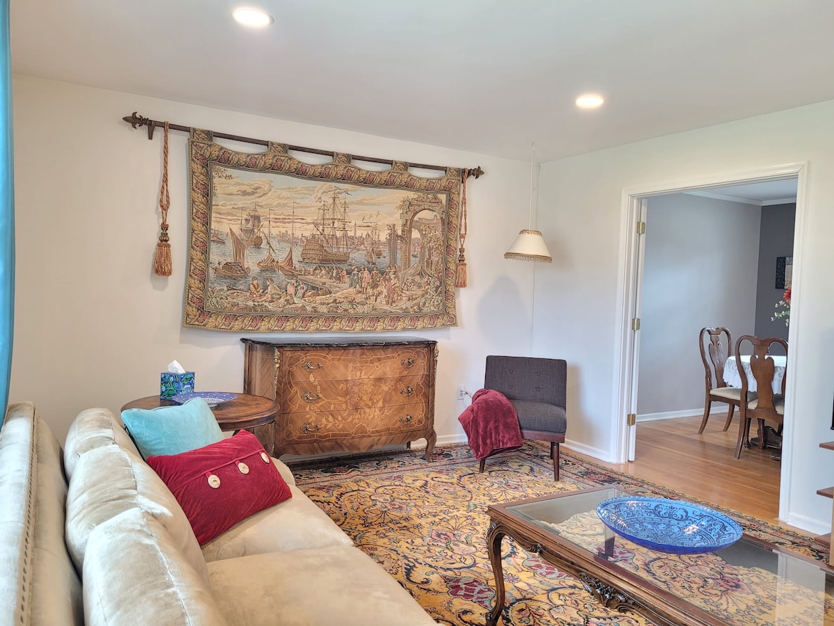 Lovely 1200 sq ft basement suite w/ private rear entrance, includes charming bedroom, full bathroom, wet bar & fridge/freezer, 3 beds (1 queen, 1 full sofa bed, 1 futon), shared laundry w/ washer/dryer, shared covered/screened in patio & backyard. Safe, suburban location close to shopping areas & GMU. Huge flat screen smart TV w/ streamed channels & subscription service sign in available. Free parking for 1 vehicle. Shared backyard w/ relaxing wooded views (partially fenced). Pet friendly!