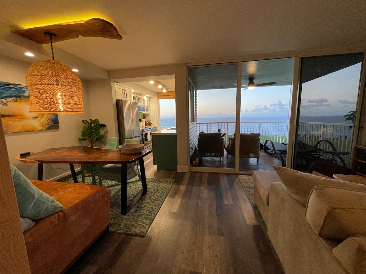 This modern and newly renovated honeymoon beach retreat has breathtaking panoramic ocean and coastline views. Lounge in the daybed while gazing at the sweeping vista from Anini reef to Kilauea Lighthouse. Some have said "it feels like being on a ship at sea" as they witness whales breaching in the ocean and waves peeling on the reef from this magical location. A rare penthouse unit with high ceilings, views from every room, even the famous Bali Hai from the deck. Truly a couple's dream!