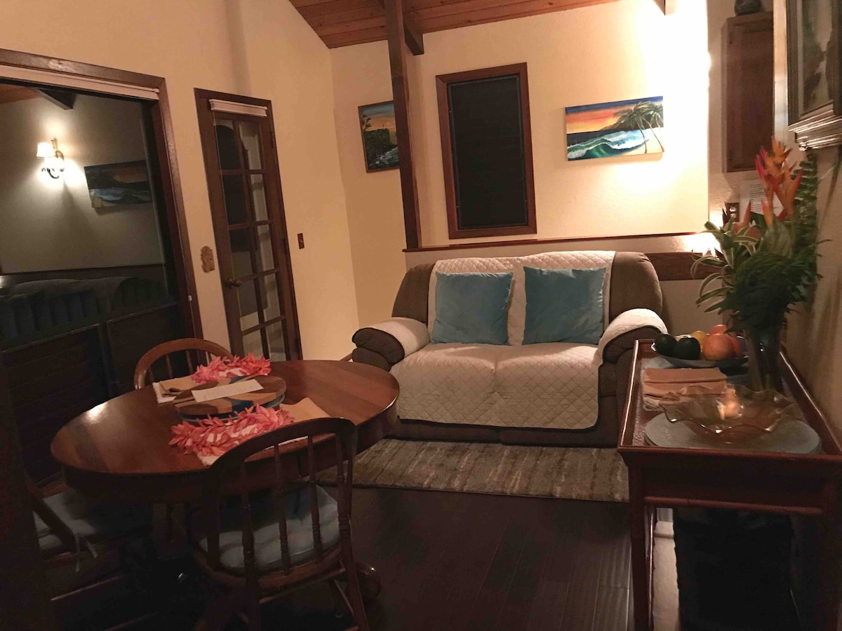 Perfectly Situated on The North Shore of Kaua'i, you are within walking distance of Hideaways Beach and Pu'u Poa Beach. The lanai views are ALL natural: trees, birds, and mountain tops; no buildings! Walk out the front door and you are steps away from Kenomene Park where you can see the stunning views of the Pacific Ocean as well as the surrounding mountains and waterfalls. Fast 400 Mbps WiFi, On-Site Parking, A/C, Full Private Bathroom, Fully Stocked Kitchenette, Linens, Roku Smart TV