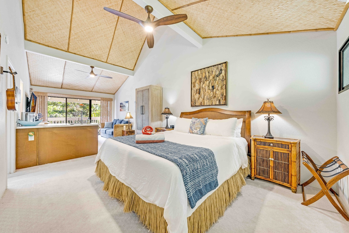 The Space A Modern Bamboo Sanctuary in the Heart of Princeville Step into a space designed for total tranquility. This boutique studio loft is defined by its stunning soaring bamboo-vaulted ceilings, creating an airy, expansive atmosphere that feels like a private treehouse retreat. Every detail, from the organic textures to the modern finishes, has been curated to provide a peaceful North Shore escape.