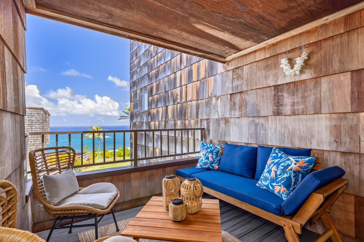 Peace & Tranquility, this upper level end unit has amazing ocean & mountain views and a private beach! Condo is fastidiously clean, everything you will need for a perfectly tranquil stay. Walk to the 1Hotel Hanalei for a variety of world class restaurants. 2 min. to the Robert Trent Jones Makai golf course. 2 bedrooms w/ensuite bathrooms w/ king beds. Steps from the pool and Hideaways Pizza. Kitchen has all new appliances. Whale watching from the Lana'i w/ 4 comfy chairs. Convenient parking.