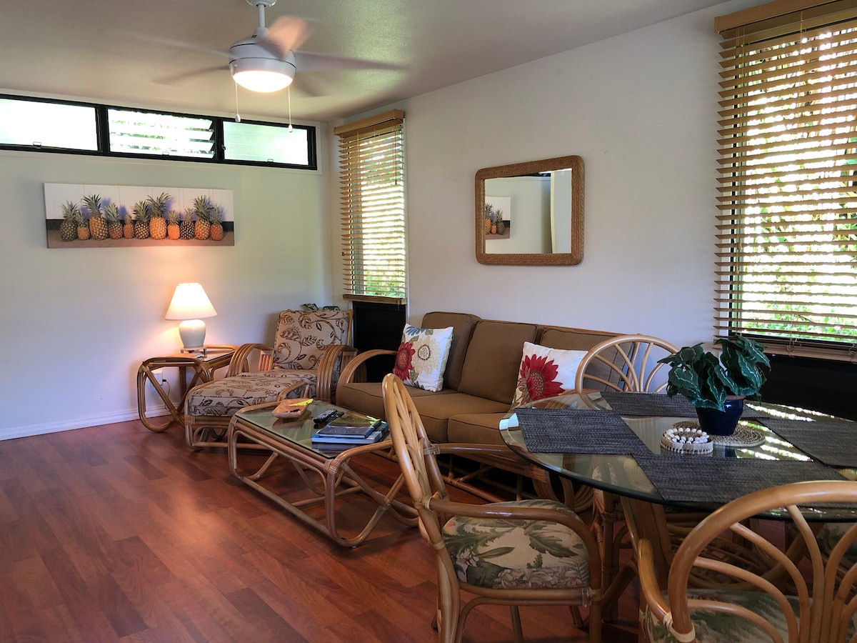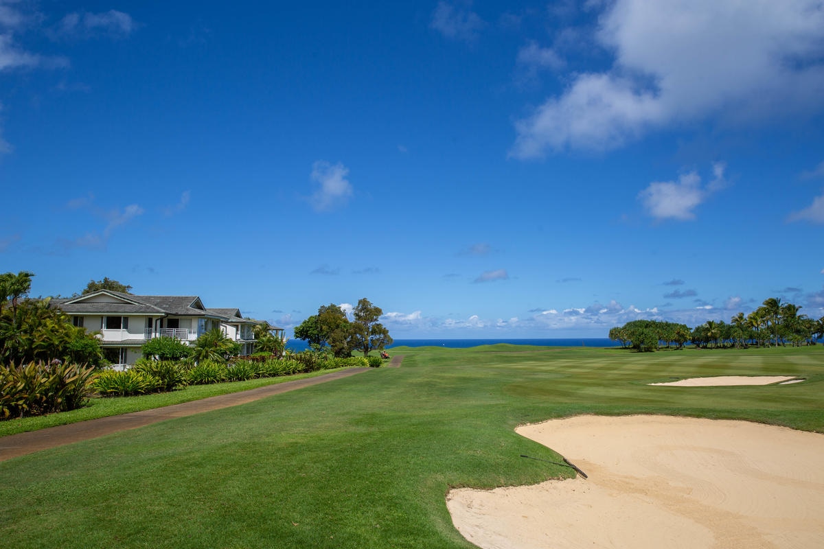 Newly updated 1-bedroom ocean-view condo in Emmalani Court, an exclusive 42-unit complex walking distance to Princeville Resort, Happy Talk Bar, Hideaways Pizza, Princeville's spectacular sunset viewing lookout, and a number of hidden beaches. Our condo sits on the world-famous Makai golf course with ocean views from both the living room and bedroom. Cool trade winds flow throughout the unit and there’s cold A/C in the living room for extra warm days!
