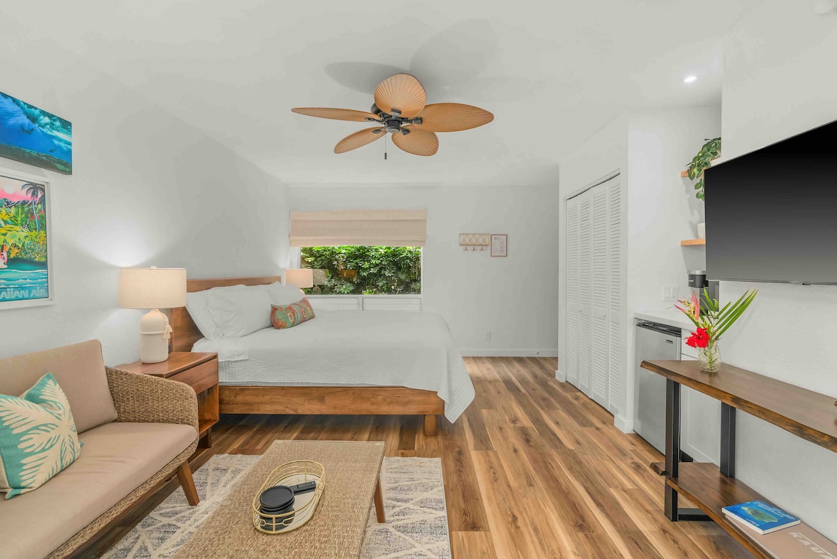 Stunning north shore suite, newly renovated with a captivating view of the verdant mountains surrounding Kauai's iconic Hanalei Bay. The suite offers a California King bed, sectional sofa, 50" TV, kitchenette studio with cathedral ceilings and covered lanai to watch the sunset over the Hanalei Ridgeline. The waterfall saturated jungle mountains will have you feeling like you woke up in another world. Aloha!