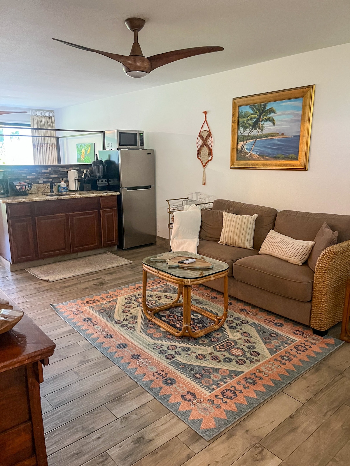 Enjoy the cooling trade winds while watching spectacular view in front of you as you are lounging on your private oceanfront lanai (patio). This very comfortable condo provides spectacular full ocean view and sunsets plus a rainbow or two if you’re lucky. The spaciousr suite has a comfortable cal King Size bed with a private full bath.. The roomy fully equipped kitchen offers you ocean views from every window. Recently fully, beautifully renovated .