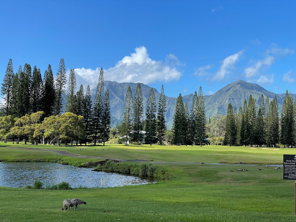 Enjoy our 22-acre Oceanview Resort on the romantic North Shore! Just 10 minutes from world-famous Hanalei Bay and tropical beaches, the resort offers 2 swimming pools, waterfalls, hot tubs, a putting green, gym, tennis & pickleball courts, grills, e-bike and Tesla rentals. Our beautiful condo features a fully-equipped kitchen and opens onto a lush garden lanai. "The nicest unit in the entire resort," say the housekeeping staff. "Most responsive management team," say front desk. Look no further!