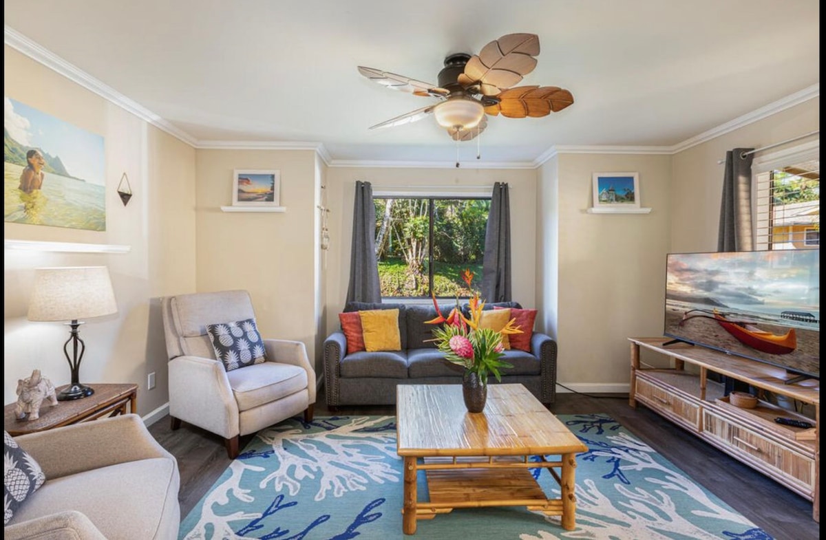 Escape to this private Hawaiian paradise, tucked away in a family friendly neighborhood minutes from Hanalei. Walking paths to shops, beaches, outdoor markets, cafes and grocery store are out the front door. Mornings on the lanai promise bird songs and tranquility as you sip your coffee or maybe you'll catch a few waves at Hanalei Bay before breakfast. Evenings dazzle here as you unwind and relax under twinkling cafe lights. You'll come for the beach but you'll stay for the rainbows.