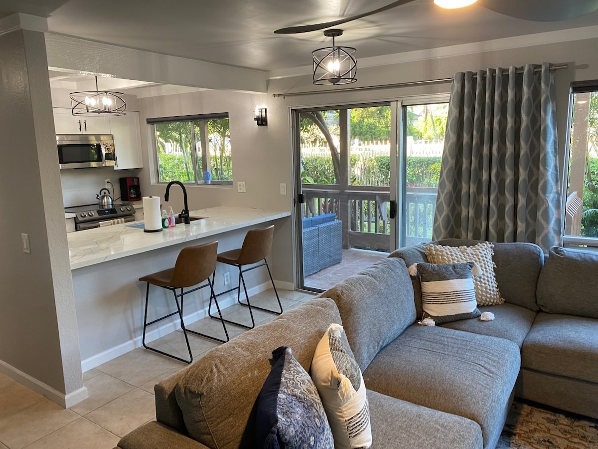 This condo was just fully renovated, and is located on Kauai's beautiful North Shore in Princeville. Furnished with a king-size Beautyrest bed, full kitchen, flat screen TV (Netflix and Hulu included), washer and dryer, and reliable wifi. Close access to community pool, hot tub, and grills. Walking distance to Hideaways Beach and Queens Bath. Be ready to enjoy the breathtaking views, world class hiking, and snorkeling that the North Shore has to offer. It truly feels like paradise!