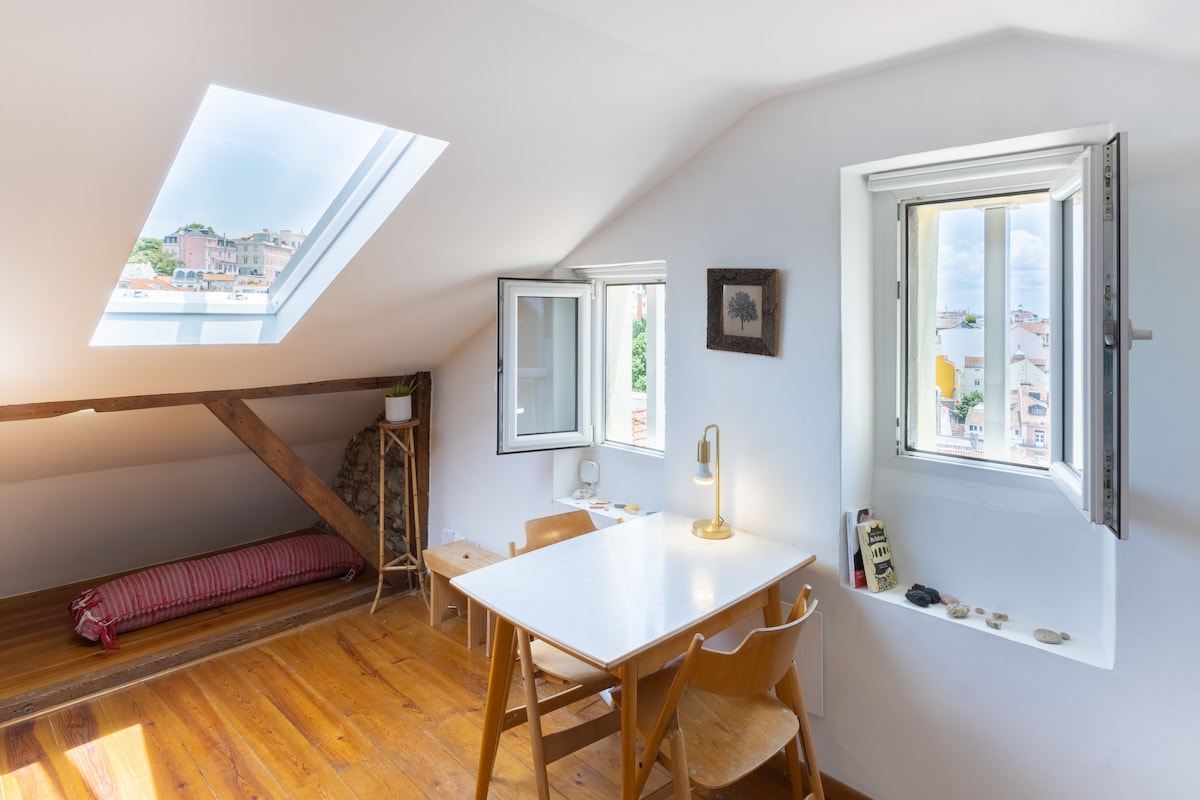 Studio with 30m2 of surface with low ceilings located on the 5th floor of a 18th century building WITHOUT elevator. Check-in time is INDICATIVE only. Please communicate with us. IMPORTANT: We do not accept bookings with a plane SCHEDULED to land after 22h. Located in Praça das Flores area. Air conditioning, modern shower room and plenty of sun light. View above the roofs of Lisbon. Comfortable bed and new linen. Extremely quiet and two minutes walk from many restaurants and social places.