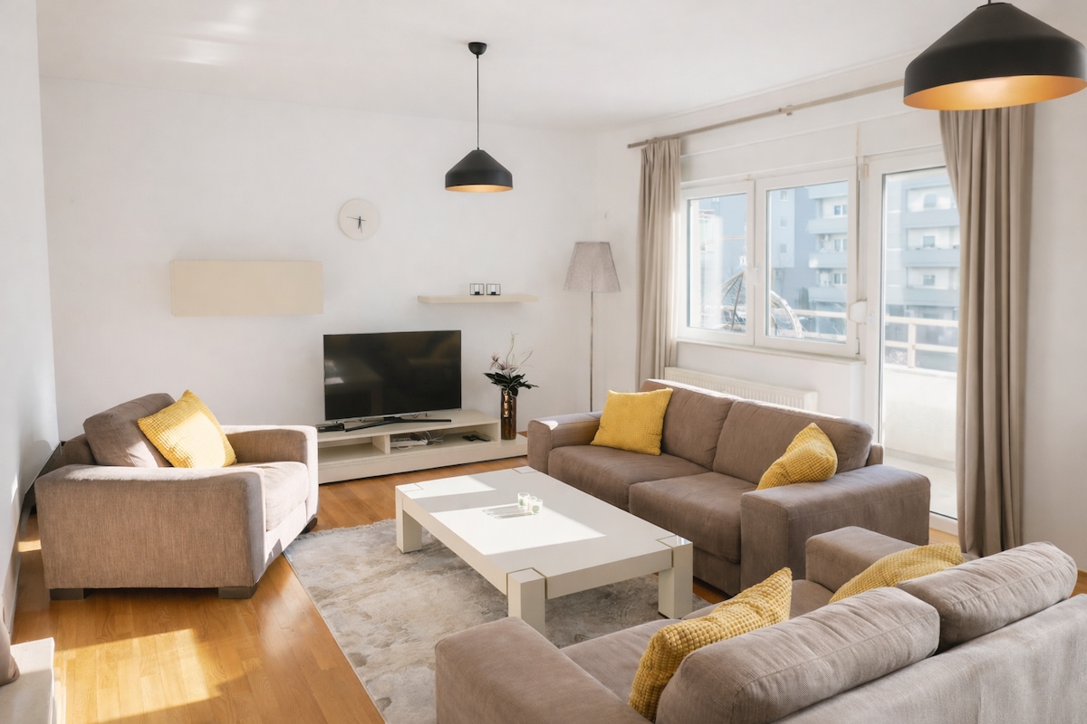 Cozy Urban Apartment was recently renovated and fully equipped in a strategic location of Pristina. This beautiful 90 sqm modern apartment on the ground floor is located 1.7 km from city center, with 12m2 private balcony, quiet and relaxing place, a luxurious cozy fireplace, very bright and well-organized living room with a comfortable sofa. Fully equipped kitchen with round dining table with comfy chairs. The apartment is furnished with high quality items.