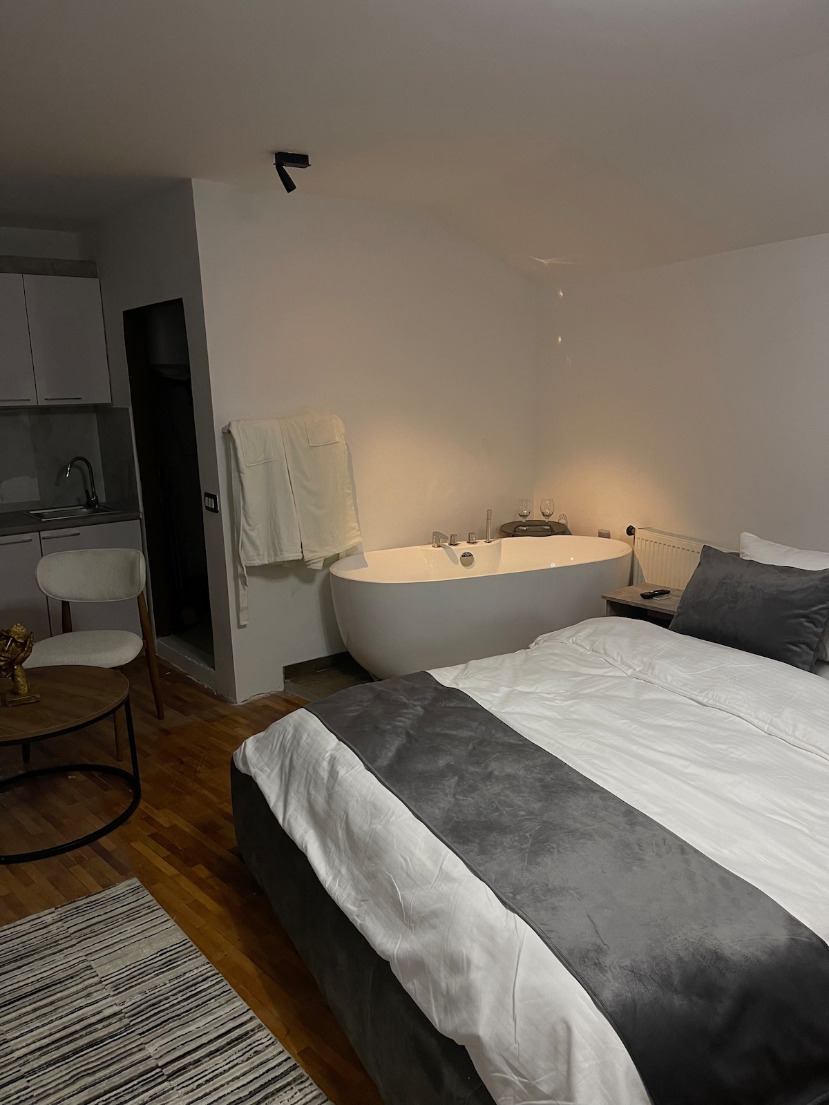 Relax and recharge in this stylish, luxurious suite apartment in the heart of Prishtina, featuring your own private hot tub for cozy evenings. Step out onto the spacious balcony to enjoy fresh air and city views. Stay connected with fast high-speed Wi-Fi, free private parking, and unwind in a comfortable living area with modern furnishings. Located in a new & modern building with elevator and staffed reception, you’re just steps away from vibrant cafes, shops, and top city attractions.