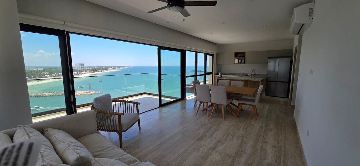 Precioso Departamento frente al mar, ideal para tomar un merecido descanso en el mejor lugar de Yucatan El departamento cuenta con cocina equipada, aire acondicionado en las 3 habitaciones + pequeño cuarto de servicio, tv, WI FI de alta velocidad 2 salas y 2 comedores así como cocina equipada con barra Vista espectacular El edificio cuenta con: Elevador Playa privada Acceso directo a la playa Piscina para niños Piscina para adultos Frente a la playa Camastros y regaderas