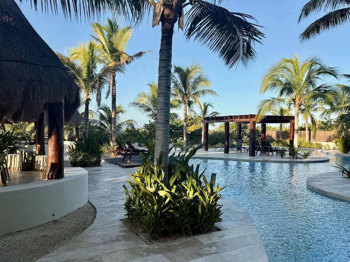Villa Lujosa decorada vibra "Tulum" con acabados y muebles de lujo. Perfecta para unas vacaciones frente al mar Disfruta la terraza y una pequeña piscina para refrescarte saliendo del mar. Duerme la siesta en una hamaca con una espectacular vista desde la habitación principal y disfruta el sonido de la naturaleza. No cobramos energía eléctrica y tenemos generador de energía para emergencias, así que nunca te quedaras sin energía y sin aire acondicionado, que por cierto tenemos en todos lados :)