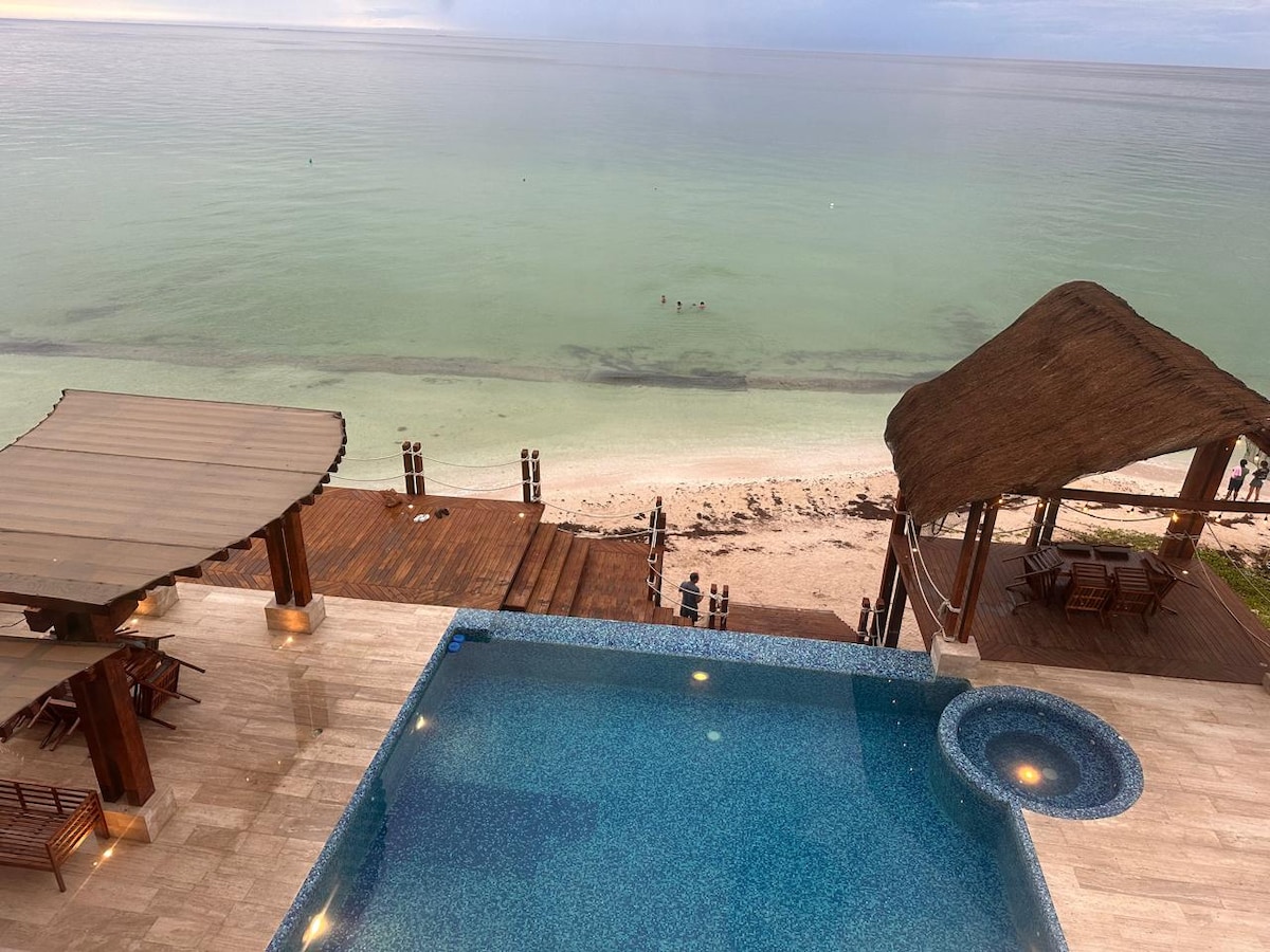 Casa en la playa frente al mar, con vista y acceso directo al mar. 3 cuartos con balcón, uno de servicio dentro de la casa y un cuarto adicional atrás. Piscina/alberca, jacuzzi, terraza en la azotea, bar y barra, terraza con palapa, comedor, cocina completa, sala de TV, segundo piso con 3 cuartos y azotea con terraza. Estacionamiento techado para 2 coches, acceso privado y seguridad 24/7 Ubicada a 15 metros de la orilla del mar, a 10 minutos de puerto progreso y 40 minutos de Mérida