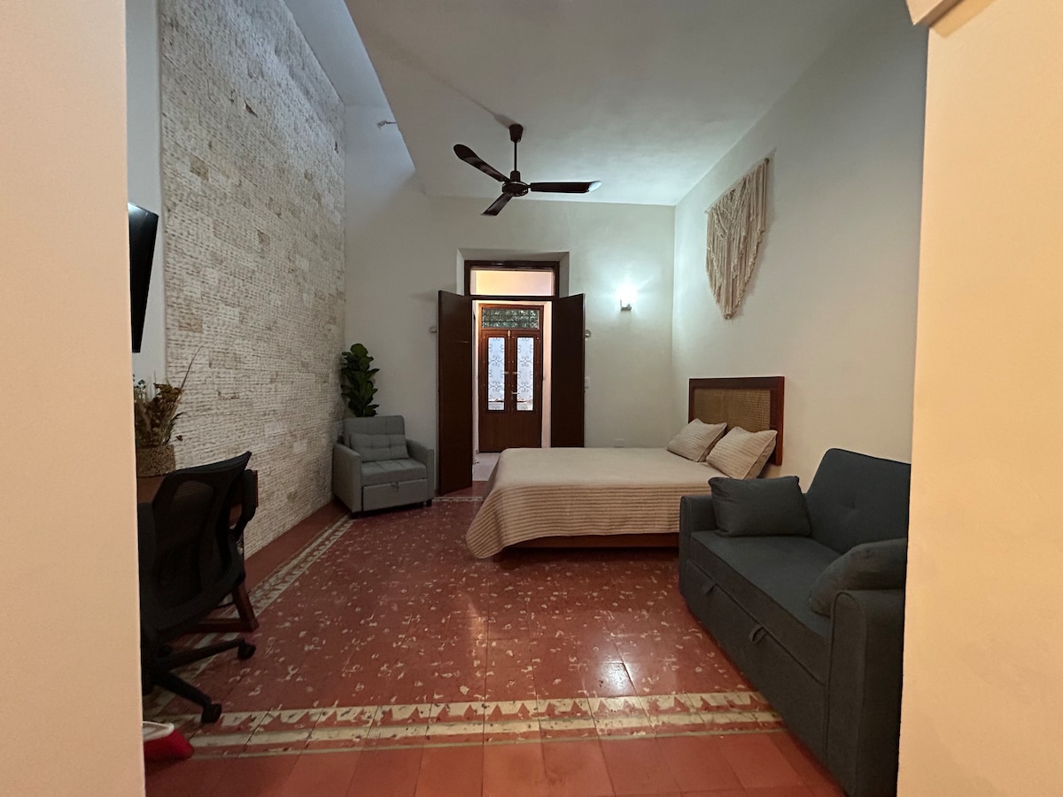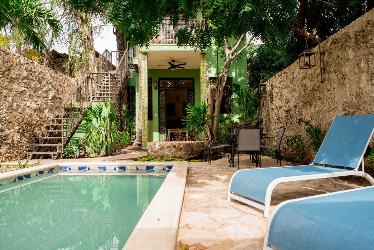 Spacious apartment inside colonial house, perfect for 2. Located east of downtown Mérida, near the ChemBech neighborhood, only a 20-minute walk from the main square. It welcomes travelers seeking calm and introspection. Unique in style and design, with luxury finishes, it guarantees privacy away from the hustle downtown. The apartment is completely private, on the lower level. It has a fully equipped kitchen and living room, a pool, a garden, a terrace, one king bedroom with a marble bathroom.