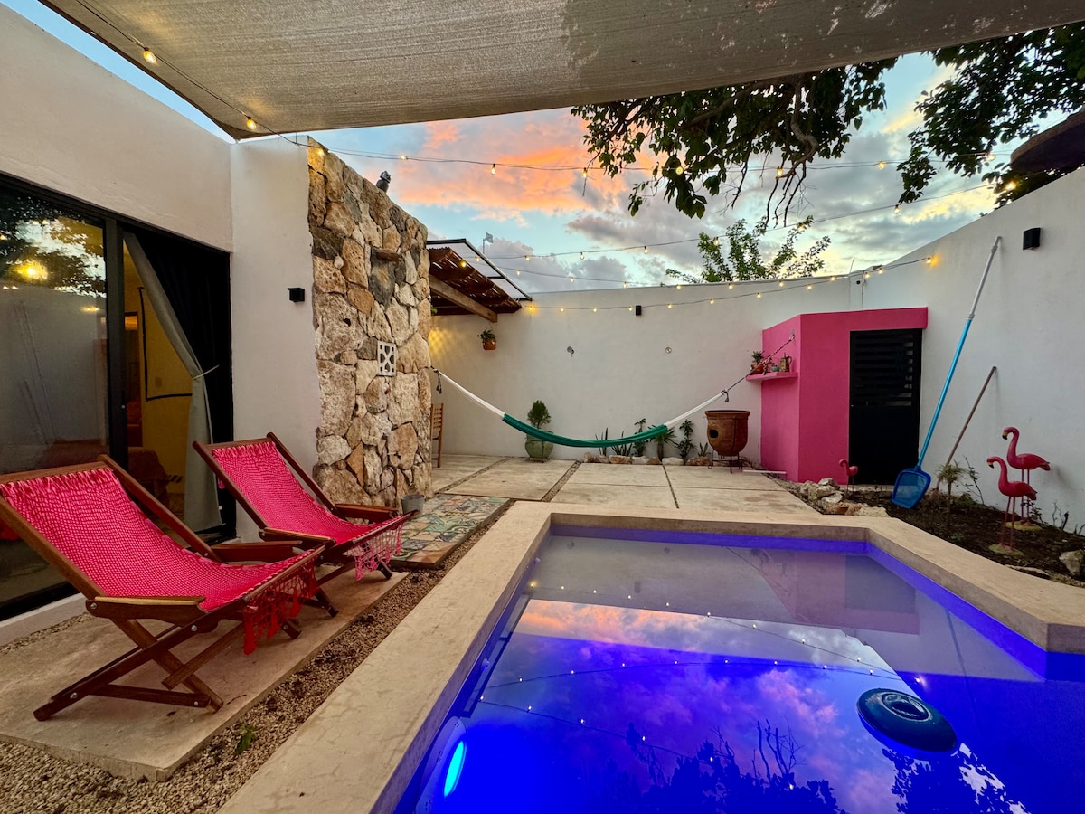 Casa Yolanda is a welcoming, 2-bedroom home in a friendly and safe local neighbourhood. The house features a workspace, comfy beds, a cozy living room plus a well-quipped kitchen, screened-in dining area, private patio and pool and safe street parking. 6 minute walk to Gran Parque La Plancha and access to the Calle 47 Gastronomic Corridor. 8 minute walk to Chem Bech market 18 minute walk or 5 minute uber/taxi ride to Paseo Montejo. 28 minute walk or 10 minute uber/tax ride to Plaza Gra