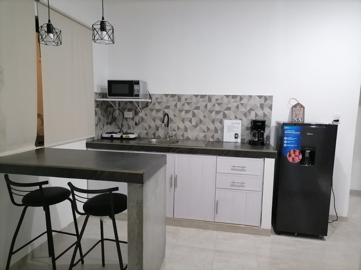 Depto T'HO 13, sencillamente acogedor, ubicado en el tradicional barrio de itzimna, con una conectividad única, con estilo practico y funcional, cuenta con sala ,comedor ,cocina, bar, una habitación con aire acondicionado, área de trabajo con potente wifi, televisión con cable , closet; un baño completo y un patio que invita a la relajación , ya que cuenta con sala de estar con música , terraza ,asador, piscina tipo jacuzzi y hamaca.