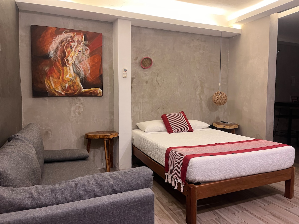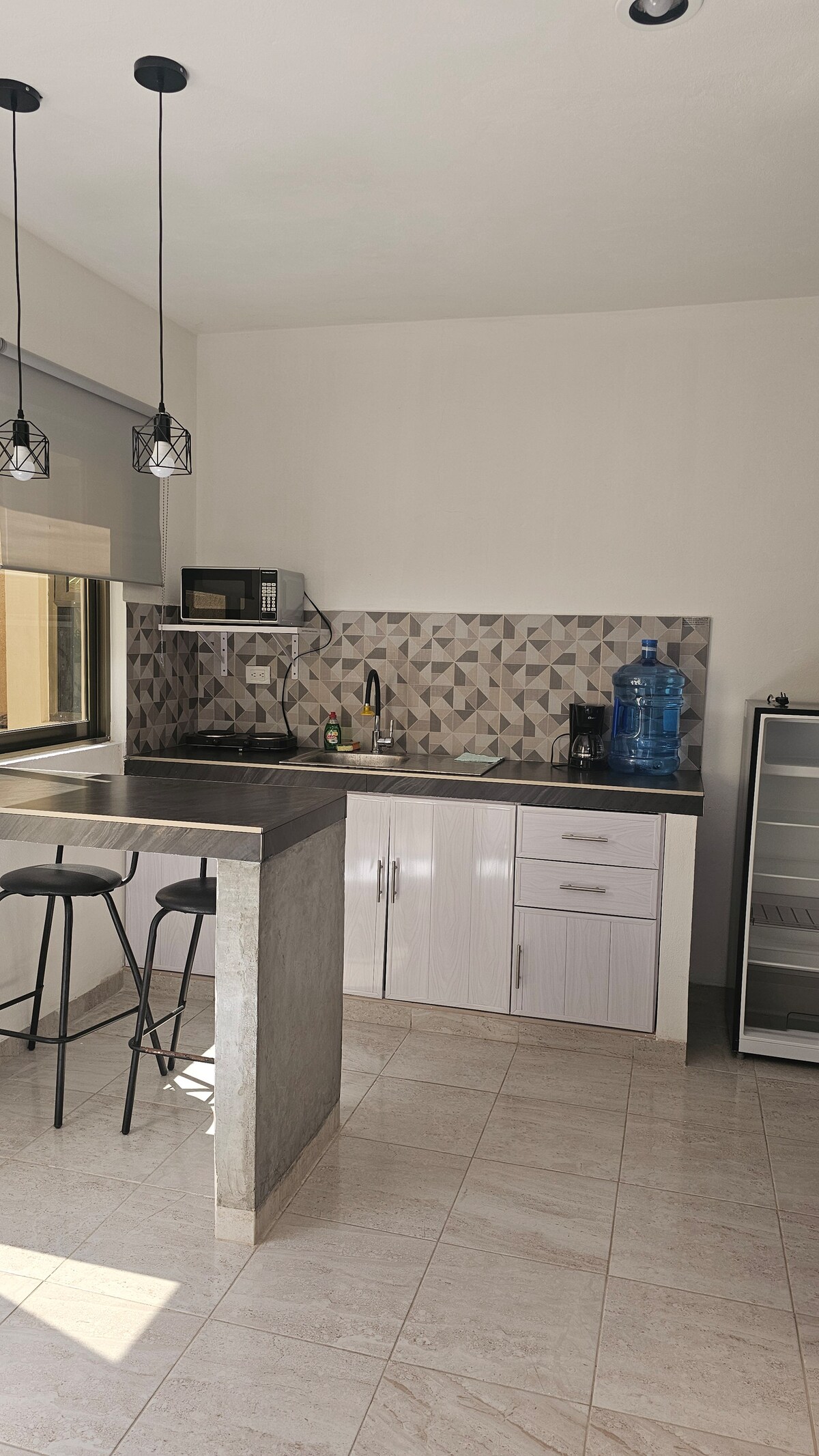 Beautiful apartment with an unbeatable location just one block from famous García Lavín Ave in the north of Mérida, where you will enjoy restaurants, the best nightlife area, gyms, supermarkets, shopping centers, and more. At Makou Apartments (Estudio R27A), you will experience a completely cozy and fresh atmosphere. Additionally, experience living in a building with unique design and amenities including a serviced bar, swimming pool, barbecue area, rooftop, and more. Equipped for long stays.