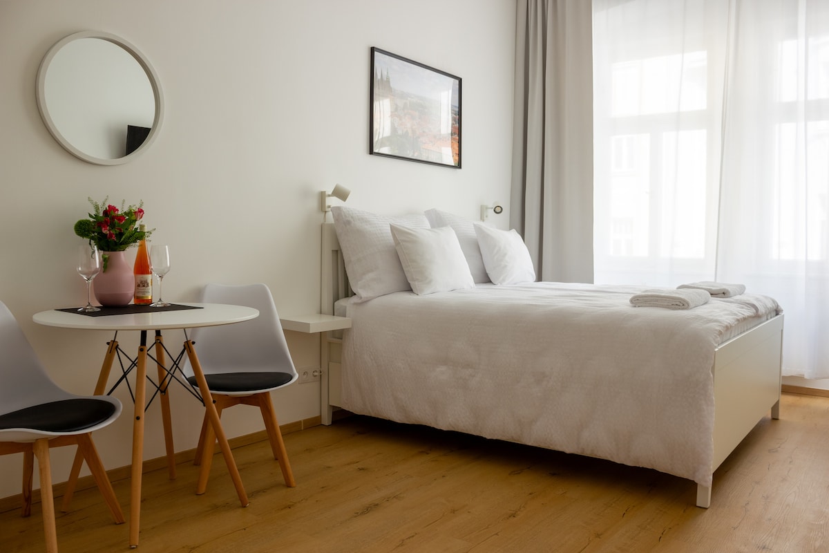 Brew an espresso in a crisp kitchenette to take onto the balcony with romantic views of the city from an Art-Nouveau building. Chevron wood floors, traditional accents, and clean-cut furnishings lend a placid vibe to this light-doused studio. This beautiful studio in an historical residence from early 20th century will make you feel cozy and like at home. It has a wonderful view of the Prague Castle from the balcony.