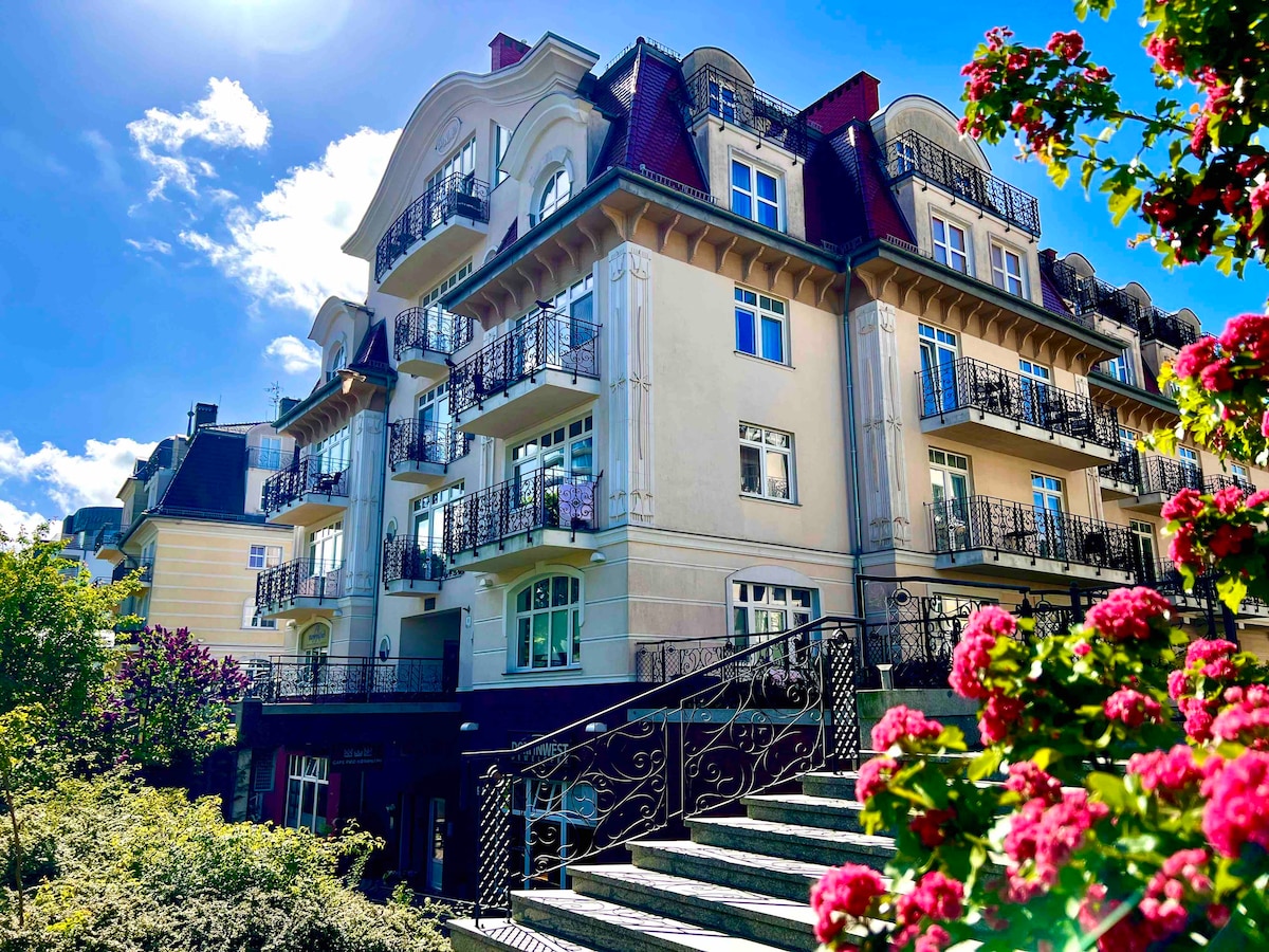 Apartament typu studio zlokalizowany jest przy Parku Zdrojowym prowadzącym do promenady nadmorskiej. Blisko bulwaru nad rzeką Świną i przeprawy promowej. W pobliżu znajduje się centrum miasta ze sklepami, kawiarniami i restauracjami. Do dyspozycji Gości jest kuchnia z kuchenką mikrofalową, lodówką i płytą kuchenną. Pościel i ręczniki są zapewnione. Goście mogą za dodatkową opłatą skorzystać z podziemnego parkingu.