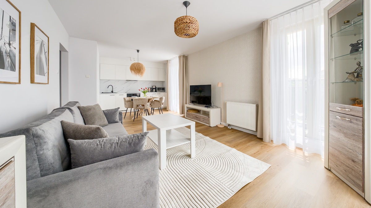 Zapraszamy do luksusowego apartamentu który łączy w sobie nowoczesność i klasyczną elegancję. Przestronny salon z aneksem kuchennym urządzony jest z dbałoscią o każdy detal. Jasne kolory i eleganckie meble tworzą wyjatkową atmosferę relaksu i komfortu. Znajdziesz tu wszystko czego potrzebujesz od płyty indukcyjnej przez piekarnik pralkę aż po zmywarkę. Przytulna sypialnia z łożem małżeńskim zapewni komfortowy sen. Gustownym uzupełnieniem apartamentu jest nowoczesna i funkcjonalna łazienka