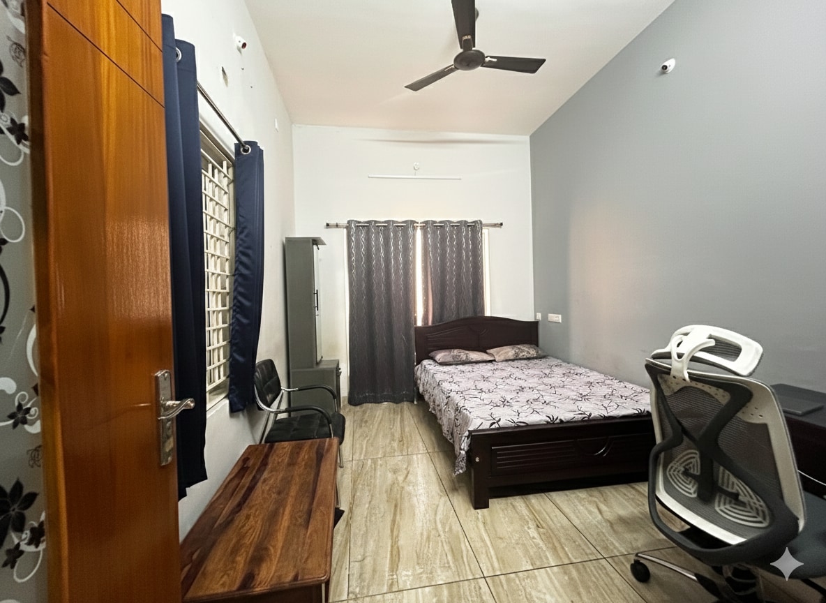 Completely Private with no sharing of any space, One Studio Room Small Apartment with a slab for kitchen & attached bathroom. New AC, cupboard, Queen bed with orthofoam mattress, ideal for two guests. kitchen area contains induction for cooking with utensils and cooking vessels. Hi-speed Internet connection for work from home Google TV with all Apps, AC, Fridge, Oven, Geyser, chairs, iron, etc, everything is there. Fully entilated place with 2 big windows. We need ID proof of all guests.