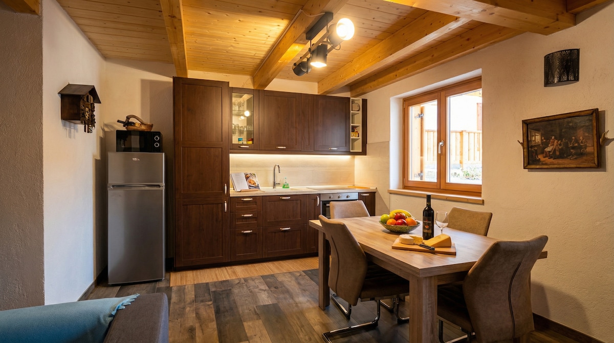 Independent private guest space with a wood-burning fireplace in a mountain boutique guesthouse. The space offers privacy and comfort, with a private equipped kitchen. It can be booked on its own or combined with additional private rooms when travelling with more people, with the price adjusting accordingly. Guests have access to shared outdoor spaces, including gardens, patio, BBQ area, and a warm outdoor bathtub.
