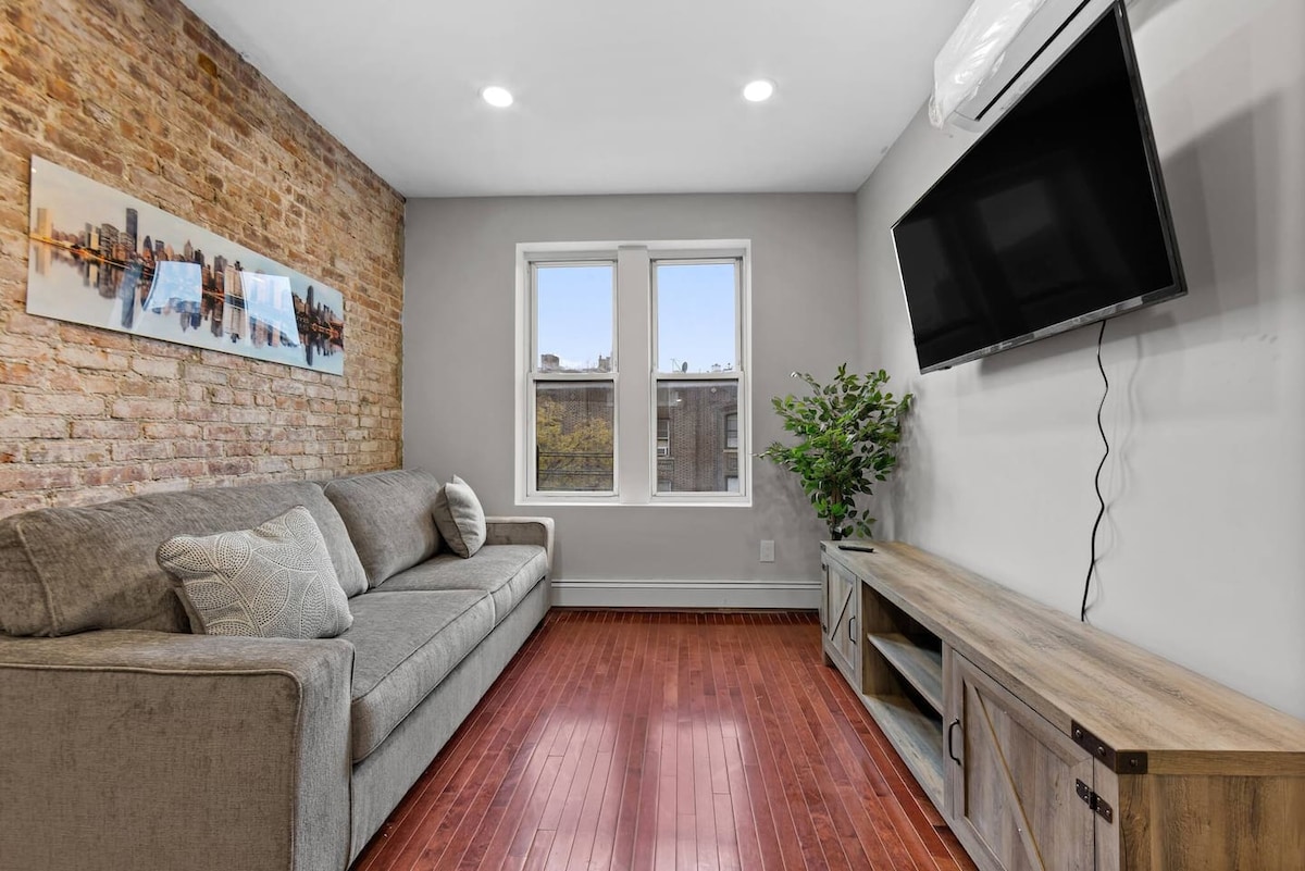 Experience the tranquil and chic ambiance of this newly renovated studio apartment in South Slope, south of Park Slope. A queen size bed & sofa bed, accommodating up to four (4) guests. The unit is fully equipped with modern conveniences such as a smart TV, split A/C system, washer/dryer, and a stylish kitchen. The charming design of the apartment features exposed brick walls, high ceilings, and a neighborhood that perfectly complements the space, evoking the essence of old Brooklyn.