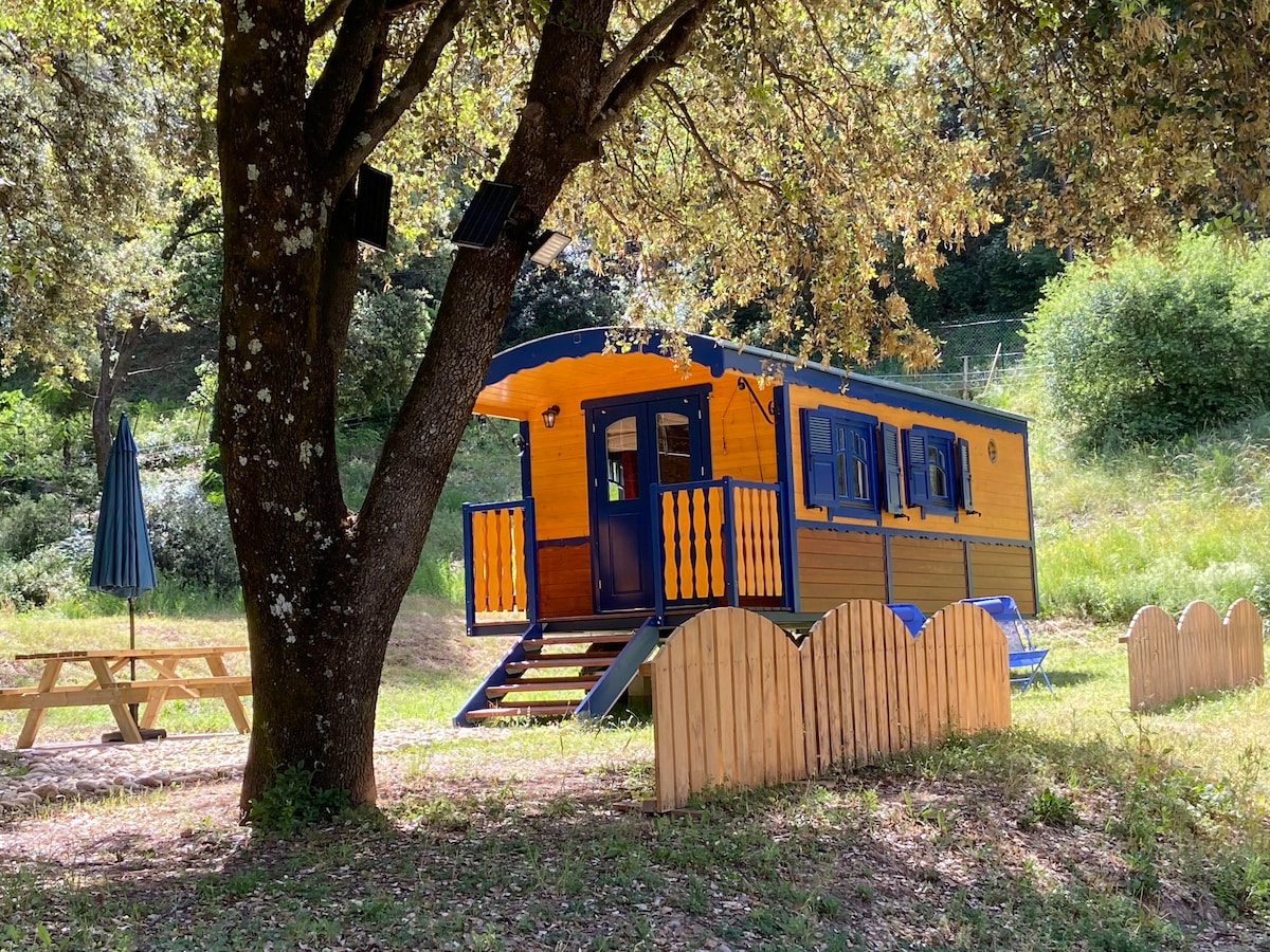 Au cœur du Lubéron, charmante roulotte type western entièrement équipée, calme, proche des plus beaux villages de notre région Apt, Roussillon, Gordes, le Colorado provençal Terrain privé sans vis à vis Vos voisins : Pepito notre âne 🙂 et son nouvel ami Nikito 🙂 Notre petit plus : un spa privatif Nous espérons vous accueillir avec le même plaisir que nous avons eu à creer ce havre de paix Petit déjeuner inclus Draps et serviettes fournis