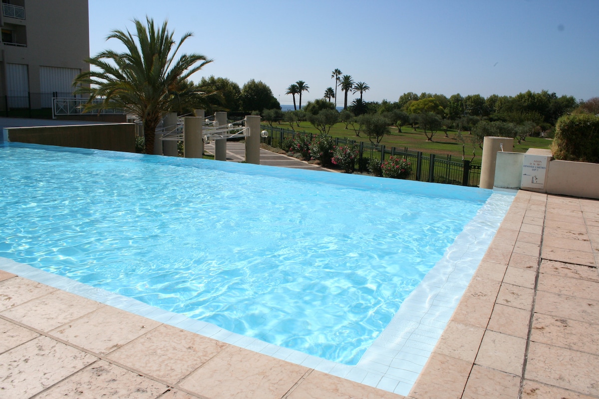 "ANTIBES LES PINS RESIDENCE" -2 BR WITH 3 TERRACES-SEA FRONT-LAST FLOOR-EXPO EAST/SOUTH/WEST... Sea facing Apartment located on the top floor of a luxury residence just above the EXFLORA Park. Direct access to the beach (100 m)-No road to cross. Secure infinity pool with waterfall+solarium as well as a paddling pool & sanitary area: Open all year round and supervised in July+August. Reduced-mobility access (access to basement, apartment, swimming pool and beach).
