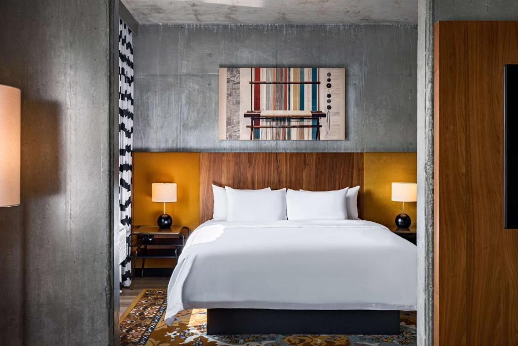 Sleeps two (or more) in a fantastically comfy king bed. All rooms feature luxury linens and a mix of custom and vintage furniture and original artwork, from European portraiture to prominent RISD photographers. The King includes a writing desk, complimentary WiFi, two hundred premium TV channels, gourmet snacks, hanging storage, along with a signature black bathroom complete with rain shower and toiletries made exclusively for The Dean.