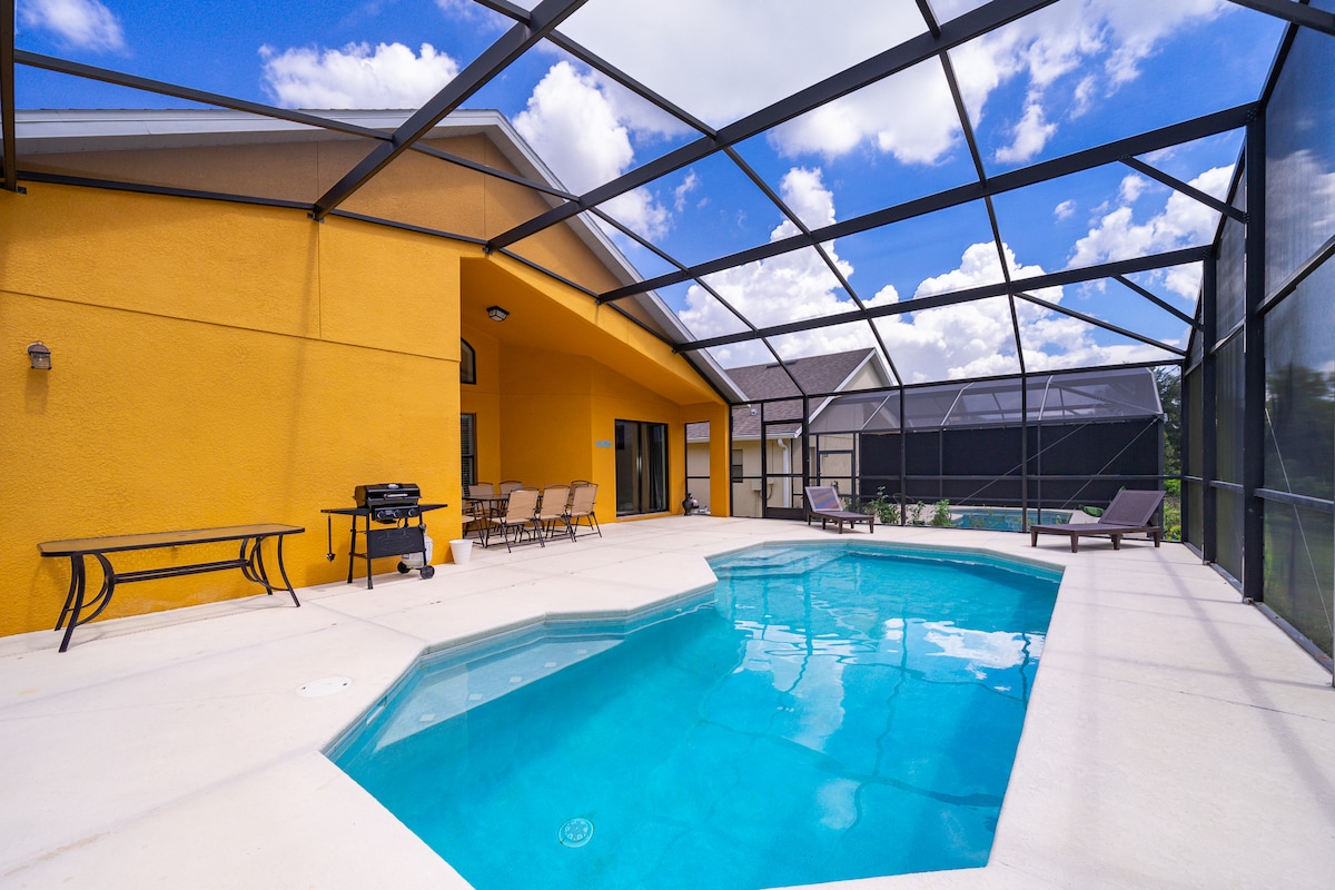 Sit back and relax in this stylish home with all the amenities you need for a fun family getaway. This home has a spacious layout with 3 bedrooms and 2 baths. We have thought of everything so you don't have to-toiletries,washer/dryer, and wifi. Enjoy your morning coffee in the screened in pool area with a beautiful sunrise and lake view or sip a glass of wine while floating in the pool. Just minutes to Theme Parks and major highways, this is the dream home you have been waiting for!