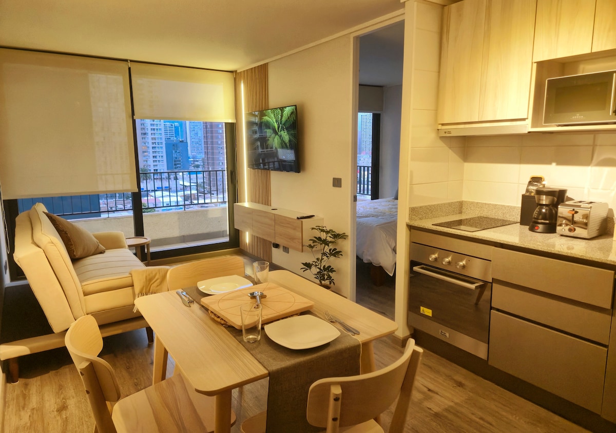 Bright, spacious and modern. Located in strategic area of Santiago de Chile, Providencia, one of the communes with the best quality of life. Pole of commercial activity, with many historical and patrimonial attractions. Excellent transport connection. 3 blocks from the Mall Costanera Center and El Bosque street, place of restaurants, cafes and bookstores. Minimalist Design, King Size Bed, Smart TV, Microwave Oven, Electric Hob and Oven, Air Conditioning Hot / Cold, Large Sofa.