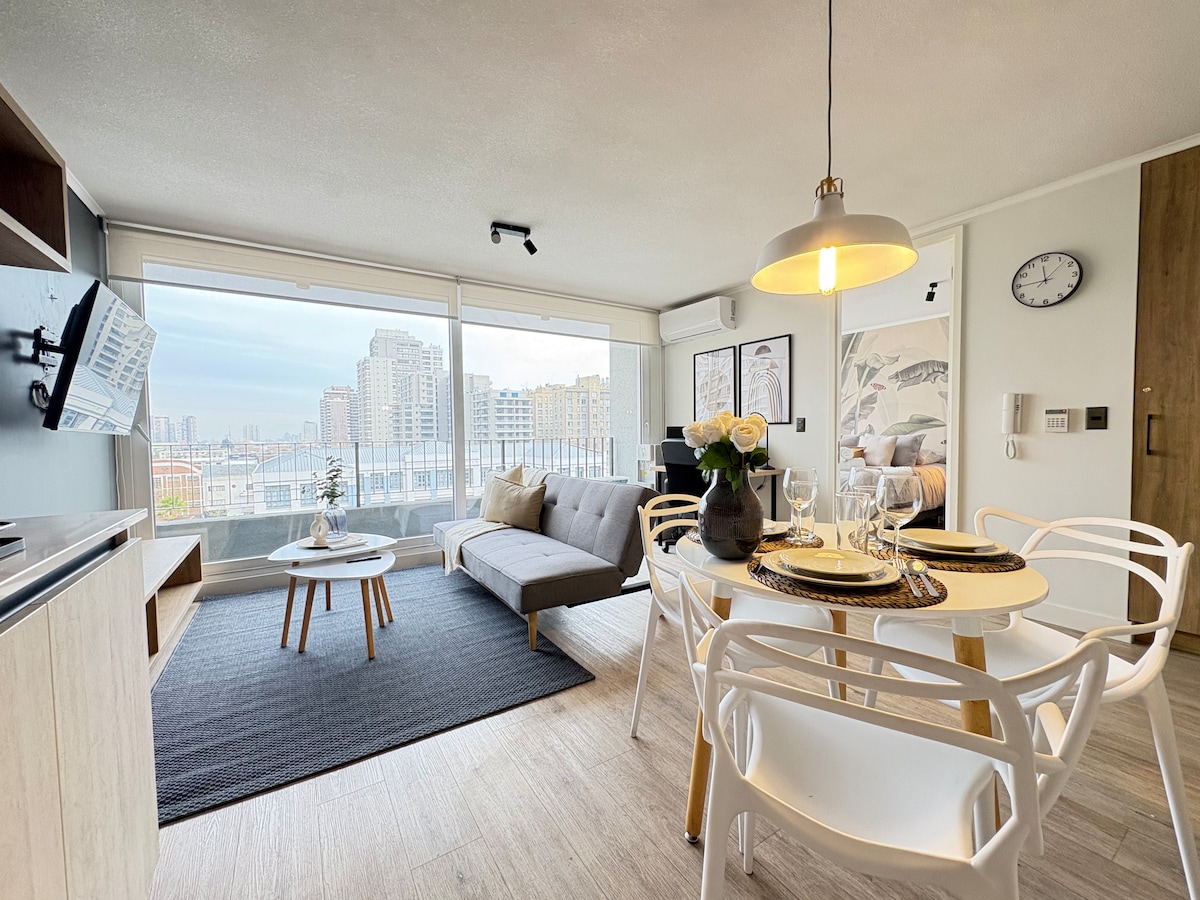 This apartment is ideal for relaxing and enjoying the city. It's centrally located, between the Santiago Centro and Providencia districts, one of the best locations in the city. It offers beautiful views of San Cristóbal Hill and the Sky Costanera. It's just a 3-minute walk from the metro and buses. Includes: Free Wi-Fi, a fully equipped kitchen, sheets and towels included, a large bed with a large Smart TV. Self-service entrance with a key, allowing you to arrive at any time.