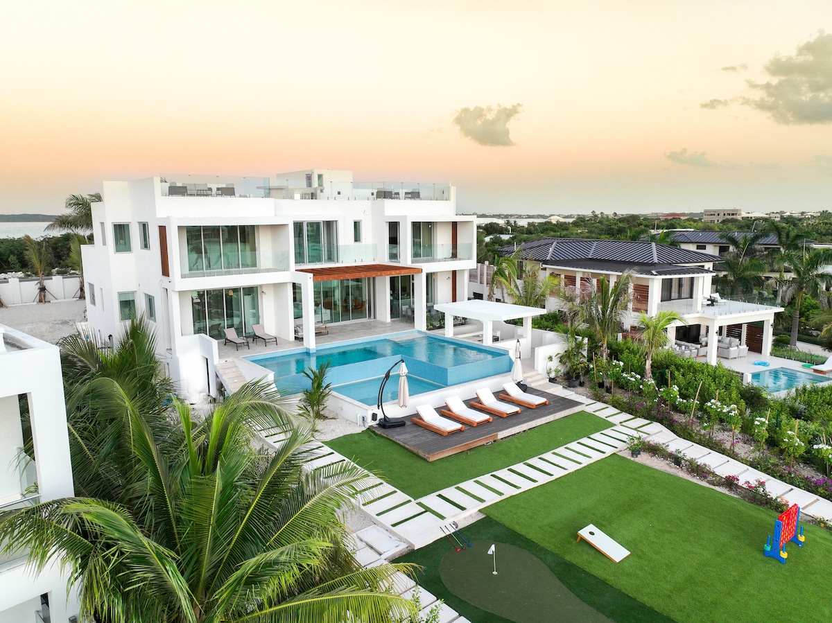 Welcome to our exquisite retreat in the heart of paradise. Azure Sunset Villa is a brand-new, modern 5-bedroom, 7 bathroom villa nestled in the enchanting surroundings of Turks and Caicos. Boasting unparalleled luxury and breathtaking views, this haven is meticulously designed to provide an unforgettable escape for all travellers. Endless amenities available at our villa range from a private beach, basketball court, mini golf, rooftop lounge, swim up bar, library, gym, hookah, firepit.