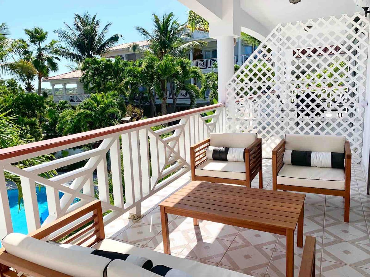 Peaceful Palm Trees with a peek of Ocean View! 10 min walk to the beach or 10 min drive to Grace Bay. Located on 2nd floor of the higher buildings, this condo is a spacious studio with Queen Bed, full kitchen, living room, bathroom, washer and dryer, Wifi and free parking. The large balcony has a pretty view over soothing palm trees dancing in the breeze, with a peek at the ocean in the distance. A great place for morning coffee or relax after long day at the beach or by the pool.