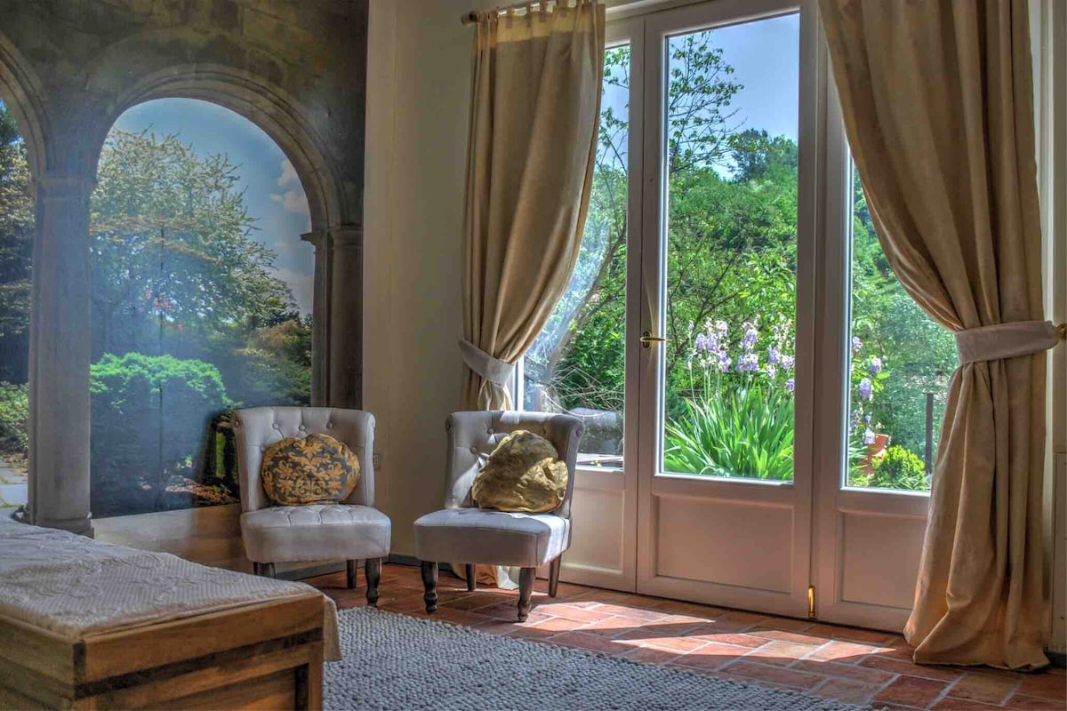 Ampia camera matrimoniale con ampio bagno, in casetta indipendente molto romantica con grande finestra su un mare di verde. Spacious double room with ensuite bathroom, in a small romantic dependance, with great view on the surrounding woods
