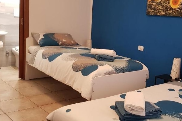 La camera ha il bagno privato esterno, la porta è appena fuori la stanza. È dotata di 2 letti singoli e si può aggiungere una culla.