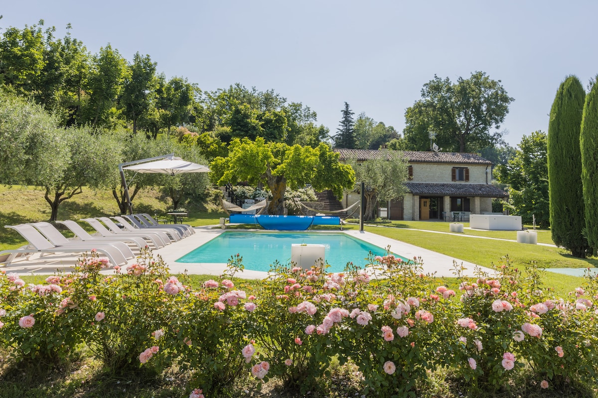 Villa Anna, nestled in the hills 20 km from the Adriatic Sea, nestled among olive and cherry trees on 20,000 square meters of lawn, is ideal for a wonderful, stress-free holiday. All amenities are ALL INCLUSIVE: the outdoor spa and gym, two hot tubs for 3 and 5 people, an infrared sauna, and a heated swimming pool (heated in the cooler seasons), with hydromassage and purified with salt water (not chlorine). At 20 min from the historic cities of Urbino and Fano.