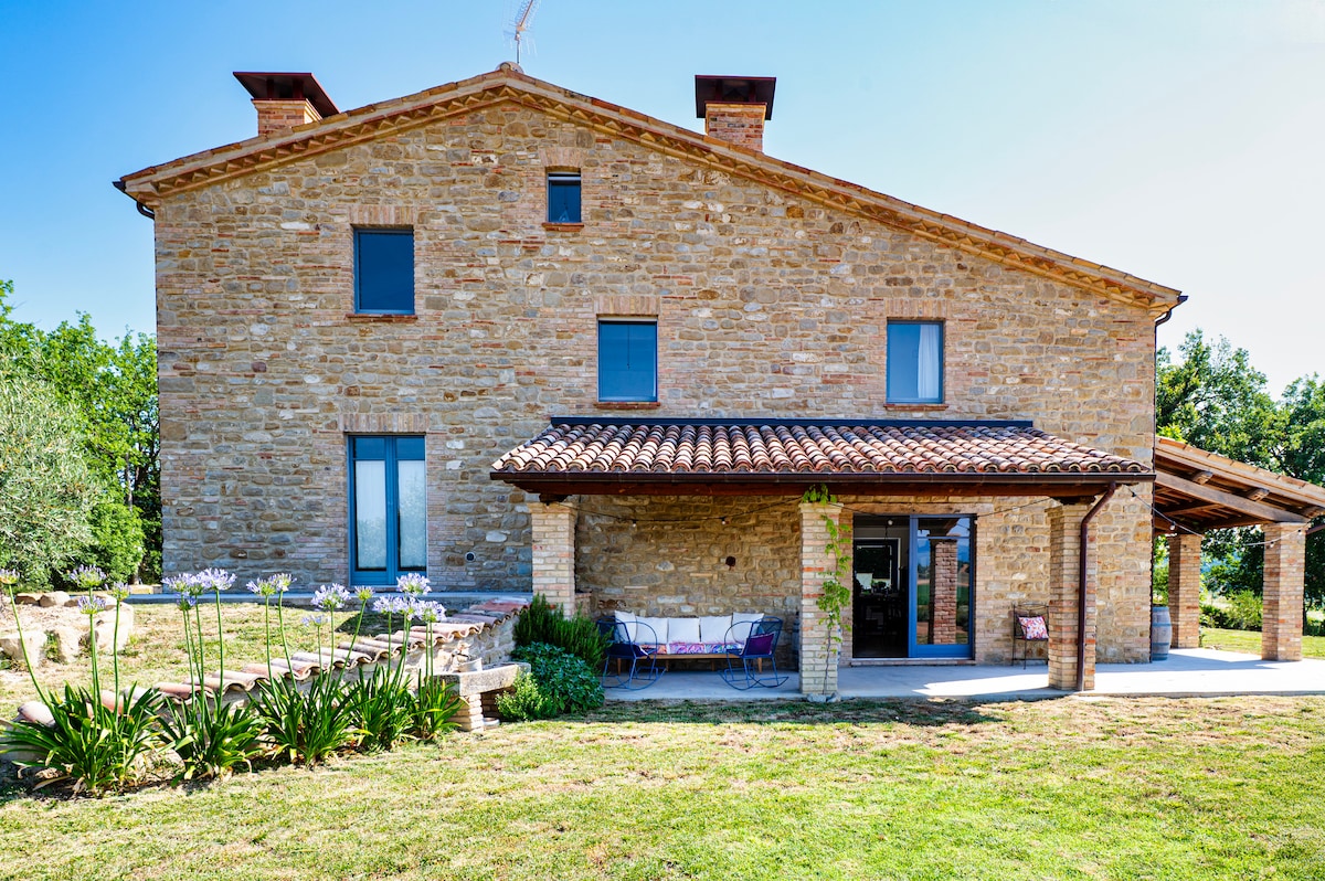 Elegante villa in pietra immersa nelle colline marchigiane con splendide viste sulla campagna e sulle montagne. Ampi spazi esterni con portici attrezzati per pranzi e cene all’aperto, e un giardino ideale per il relax. Gli interni luminosi combinano charme rustico e comfort moderni, arredi raffinati e una zona giorno open space con cucina completamente attrezzata. Una scelta ideale per famiglie o gruppi di amici che desiderano vivere un soggiorno esclusivo nel cuore delle Marche.