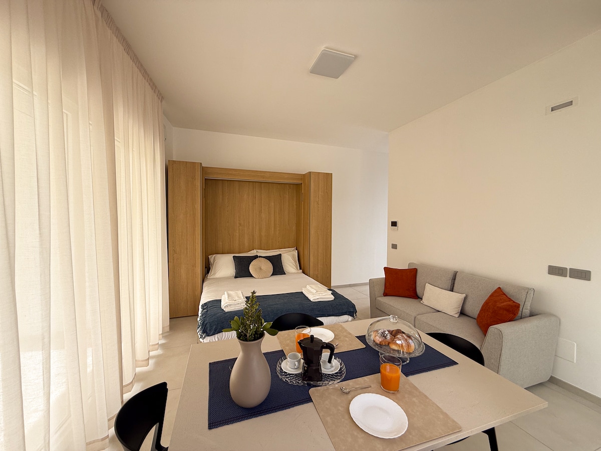 Lussuoso appartamento situato a soli 30 metri dalla spiaggia, consigliato per un’occupazione ideale di 2 adulti e 2 bambini per garantire il massimo comfort durante il soggiorno. L'alloggio dispone di: - terrazzo con vista mare, arredato con salottino e tavolo da pranzo; - camera matrimoniale con bagno privato, soggiorno con divano letto (nel soggiorno non sono presenti le tapparelle); - 2 smart TV, WI-FI e aria condizionata in ogni ambiente, macchina del caffè; - 1 posto auto.