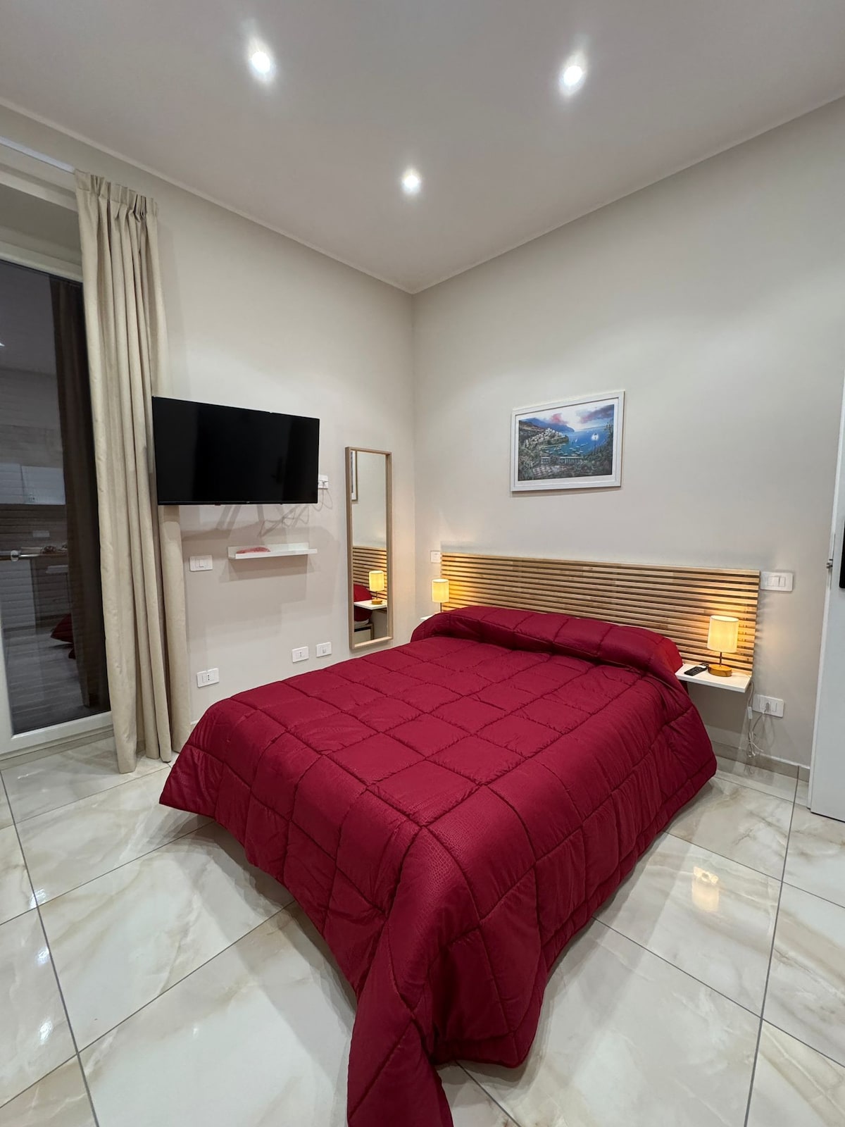 La stanza è posta in un appartamento di tre stanze con bagno in camera, mini frigo, aria condizionata a pompa di calore, rilevatore di monossido di carbonio, guardaroba per le esigenze di chi fa lunghi pernottamenti, smart tv 32" con NETFLIX e a disposizione degli ospiti (ma in comune) c'è anche la cucina (piano cottura,forno a micronde, friggitrice ad aria, macchina da caffè a cialde e bollitore). la dotazione di padelle, piatti e bicchieri e personale per ogni stanza, piano cottura e in comune