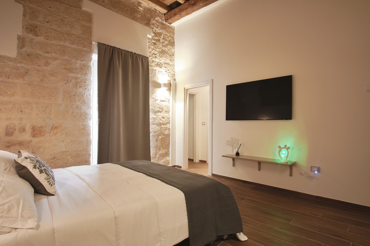 La casa si trova in una piazza vicina al centro storico, al terzo ed ultimo piano di un palazzo del '600, una volta teatro. Ci sono due terrazze: una a livello da 40mq con annessa lavanderia + un’altra di 120 mq con vista mare. In tutta la casa c'è un parquet in legno. Ci sono 2 condizionatori, 2 smart-tv, due bagni ed un bagno turco con cromoterapia. La casa, arredata con mobili antichi, è accogliente, molto luminosa e lontana da rumori. Vedi lo spot della Puglia: https://youtu.be/nSFyATE0pTc