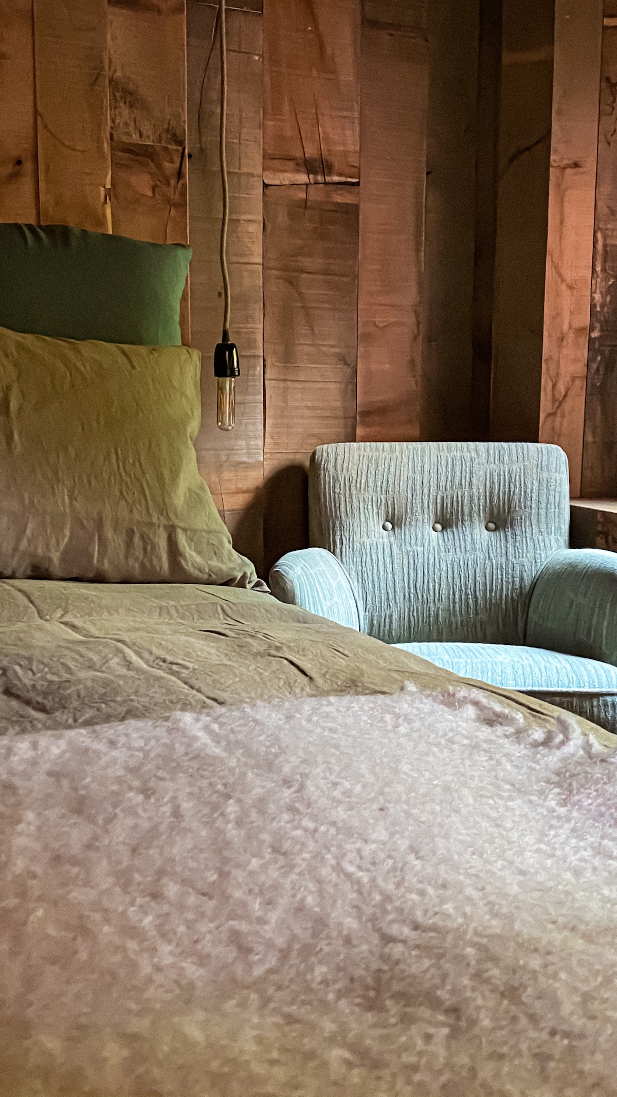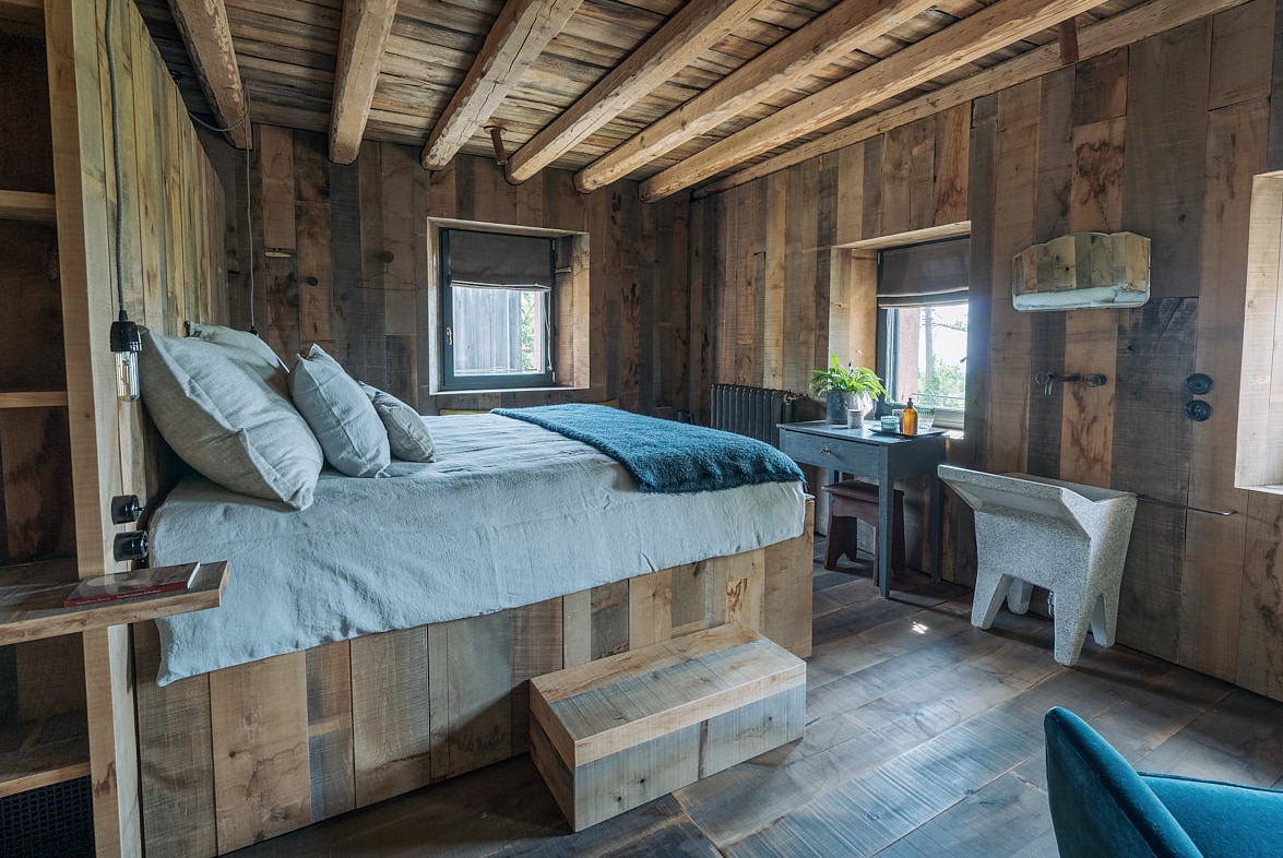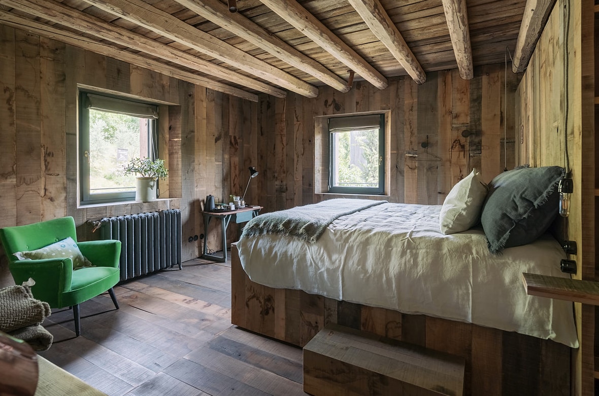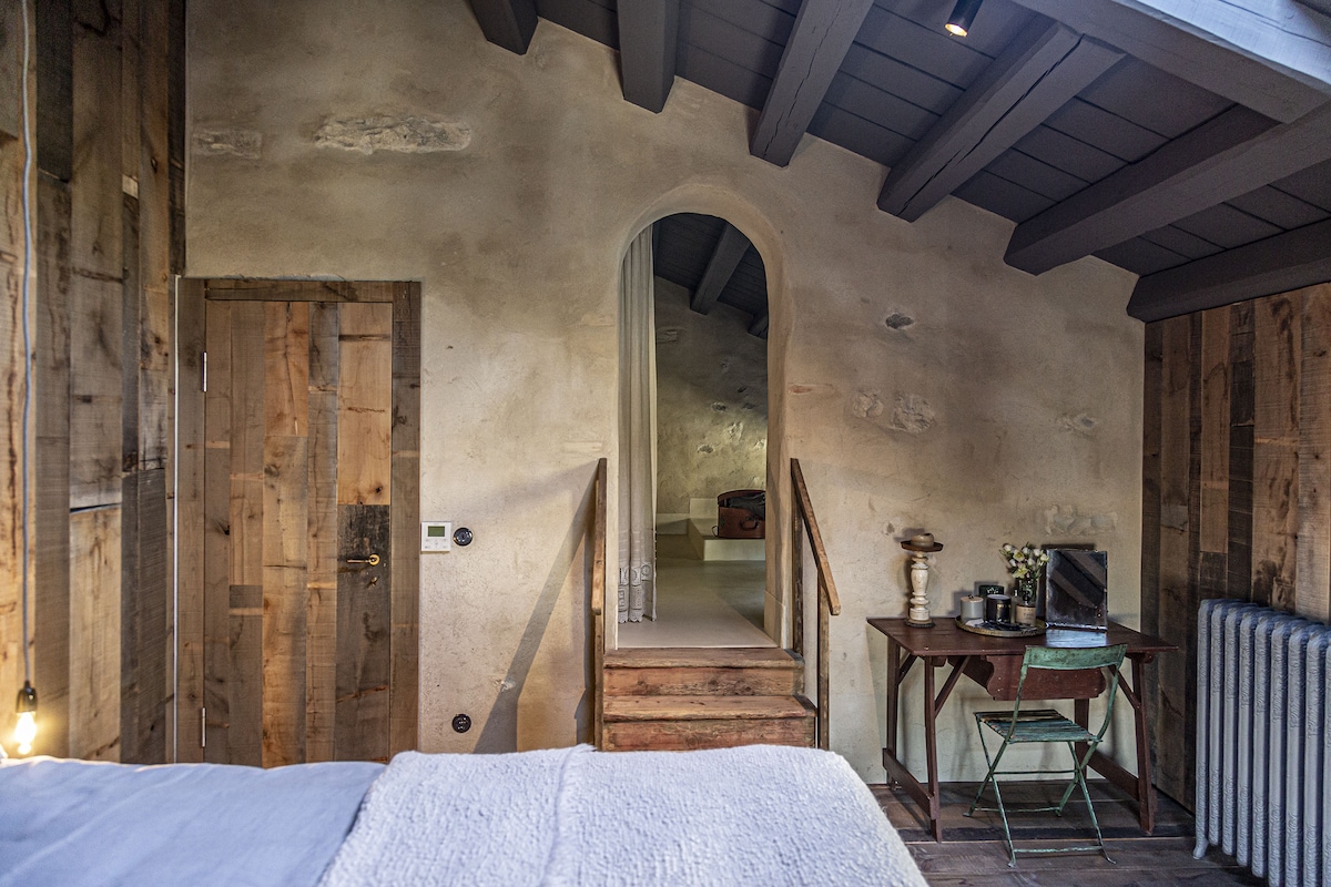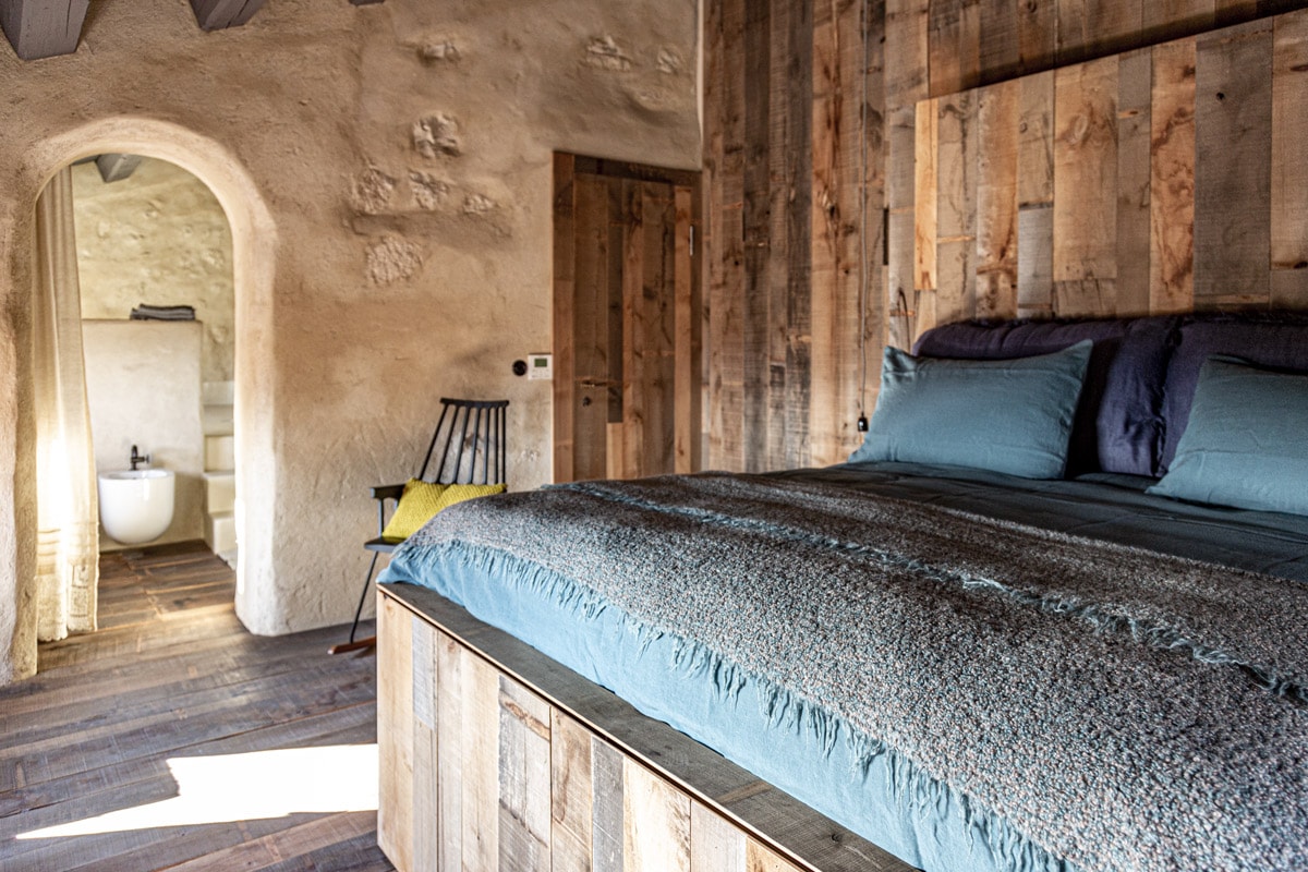 Abbiamo ricavato in collegamento alla cabina doccia, con il legno antico, un Letto di sale Himalayano, che funziona a 40 gradi per assorbire gli acidi lattici dopo le camminate. La TV motorizzata a scomparsa, comandata dal comodino, come la musica , Radio e possibilità di collegare un I-POD o il vostro smart. Ampia cabina armadio. Il termosifone color Corten ha la possibilità di azionare le ventole all’interno per un maggior contributo calorico.