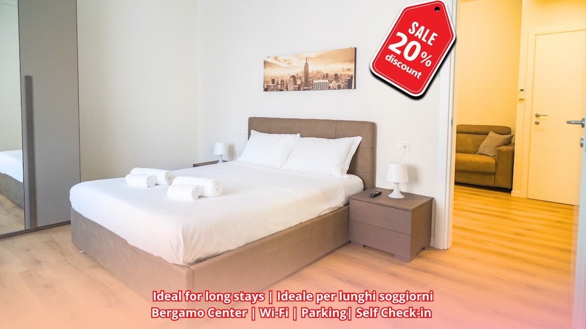 Relax in this quiet space in a semi-central location a stone's throw from the city center and the charming Città Alta. 10 minutes by car from Orio al Serio airport and the A4 Milan-Venice motorway. Large and modern studio apartment of 40 m2 ideal for 2 people max 3 (double bed + 1 single sofa bed). Modern kitchen with washing machine and induction hob. Bathroom with shower. Large balcony overlooking the adjacent park. Air conditioning and underfloor heating.