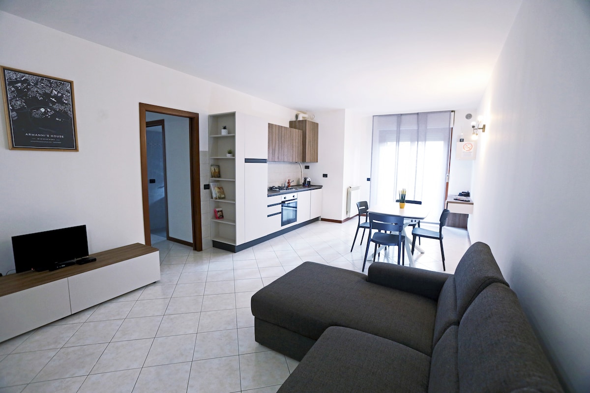 Just 2 km from BGY Airport, Orio Center and Promoberg Fair, and about 3 km from Bergamo. Independent house with garden, free parking and paid charging station. Charming and quiet one-bedroom apartment with living area and kitchenette, king-size bed and bathroom. The apartment offers excellent soundproofing and is fully equipped for a self-sufficient stay. Bus stop 450 m away and illuminated walkway to and from the airport.