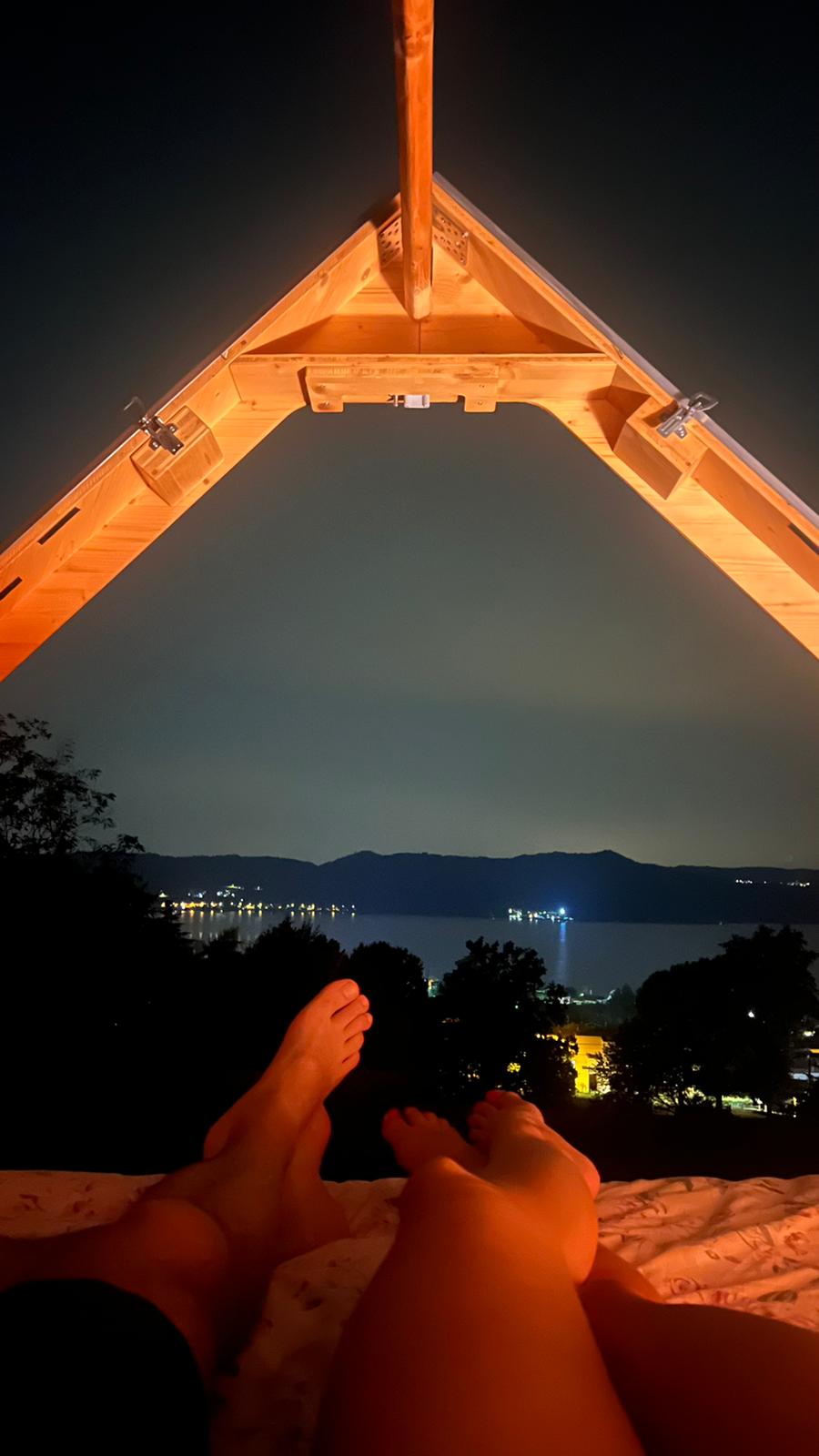 Federica proposes a small wooden nest on a balcony of olive trees overlooking the lake which, by opening the roof, allows you to enjoy a memorable starry night at night and a breathtaking view of the lake in the morning, all without giving up any kind of comfort: on the near terrace for exclusive use a veranda for the rich homemade breakfast, hydromassage tub or Finnish tub (OPTIONAL EXTRA ASK PRICE)depending on the season for a break in nature and pampering in an area with 1000 activities to do