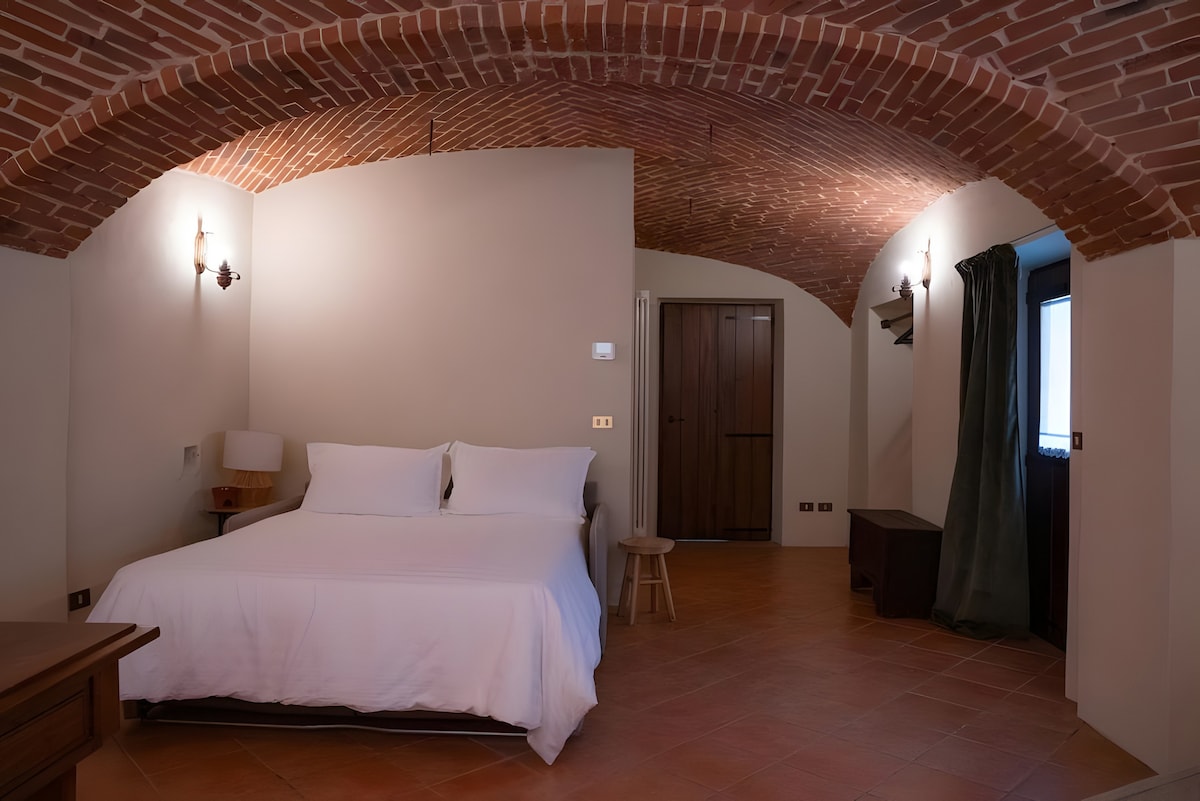 Le atmosfere di una villa signorile di fine '800 si coniugano con il design e il fascino di un antico borgo per offrirvi un soggiorno con tutti i comfort. Suite composta da camera matrimoniale con letto a baldacchino e salottino indipendente con divano letto. Completa di ogni comfort, la camera dispone di un terrazzo privato nel porticato con vista sul giardino. Arredata con gusto unisce elementi di design , come Kartell, Gessi e Alessi con pezzi di antiquariato di proprietà della famiglia.