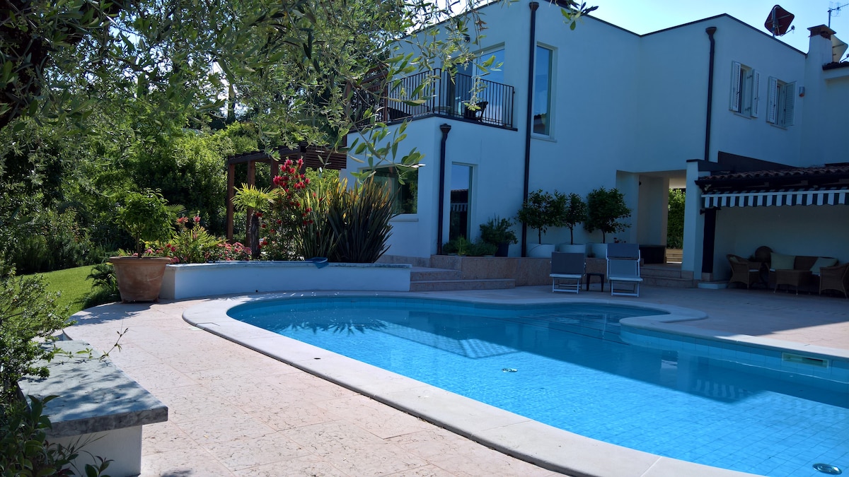 Если вы хотите единения с природой,то мой дом вам идеально подойдёт! Он расположен рядом с парком на берегу озера. Рядом исторический центр с замком, очаровательными ресторанами, термальным SPA. В отделке дома использовала много дерева, экологичные ткани. Дом максимально подходит для комфортного проживания современного человека. Дом расположен в шикарном охраняемом комплексе с тремя бассейнами. От дома легко доехать до Вероны, Милана, Венеции на Всемирные выставки, концерты и экскурсии.